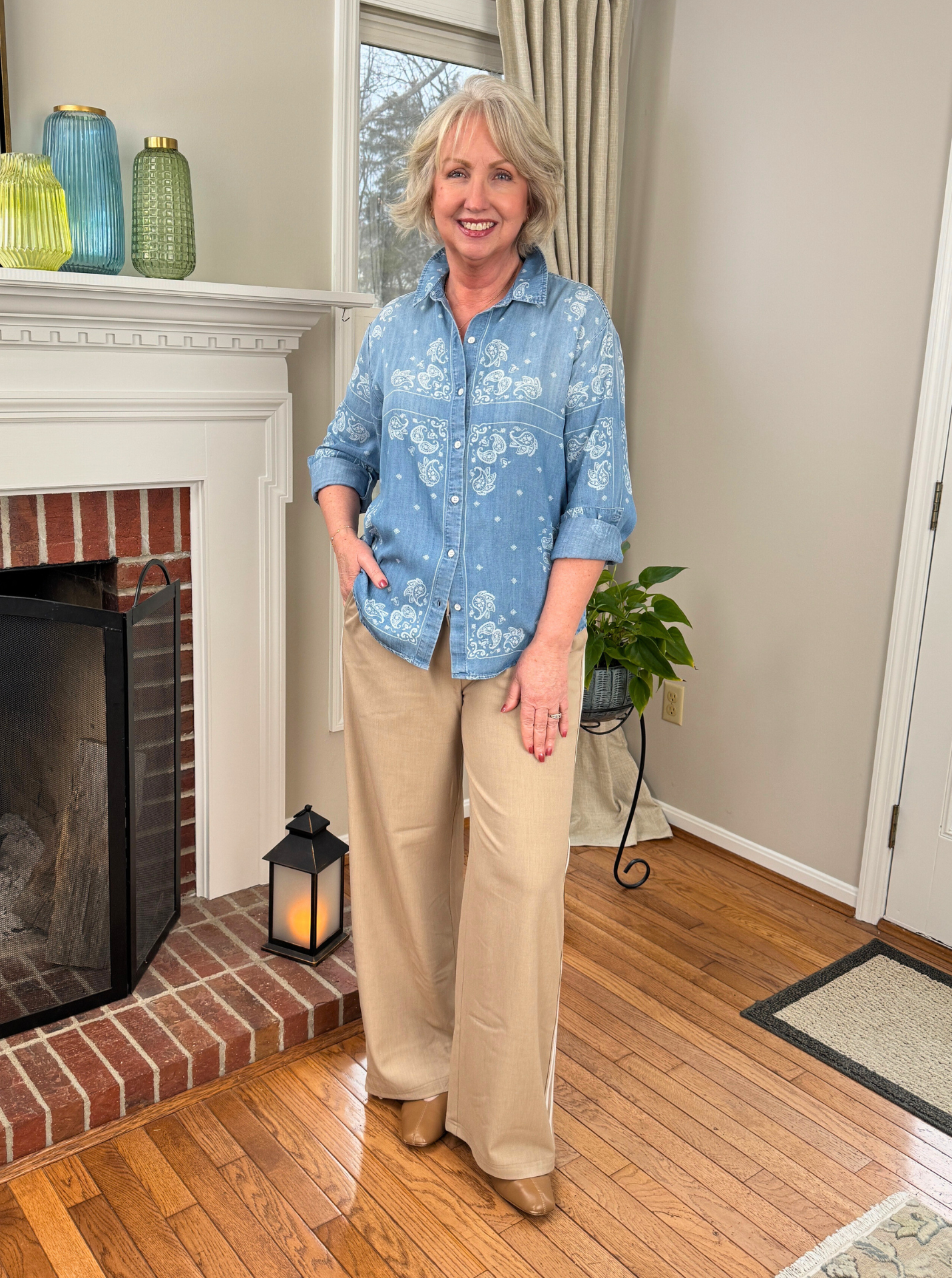 We’re going to see several top sellers from my video, Update Your Wardrobe Now with this One Fashion Trend. This bandana print shirt is super soft and has a beautiful drape, making it lovely to wear untucked. The brand, Cloth & Stone, is known for their soft fabrics and this one does not disappoint. It runs true to size and is still available. But I expect this transitional wardrobe beauty to sell out fast.
