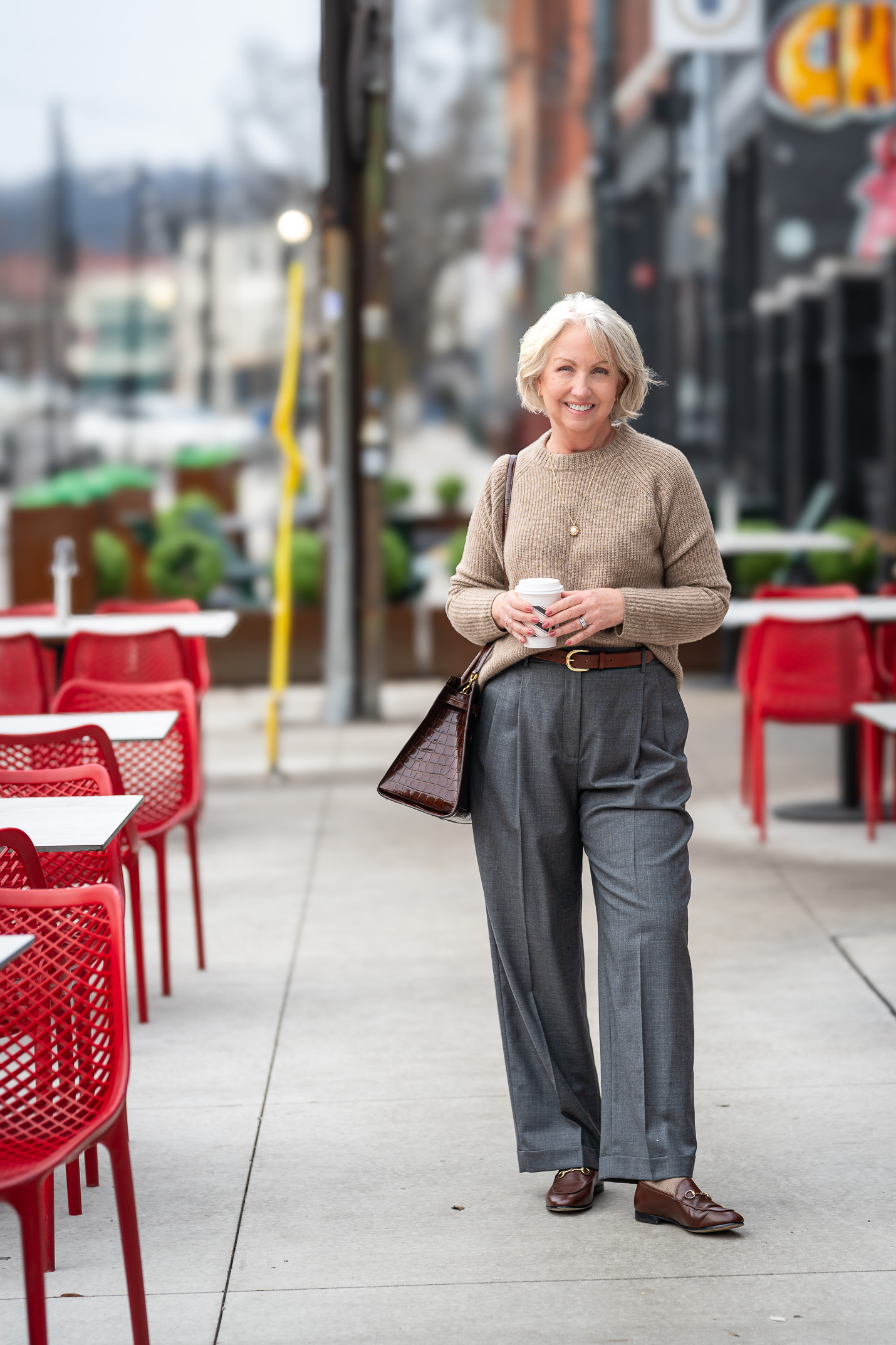 I suggest keeping your hairstyle soft and feminine, wearing a little makeup, adding some pretty jewelry and maybe tying the look together with a silky scarf. Looking back, I wish I’d added a silk neck scarf here, maybe one with just a little bit of color. What do you think?