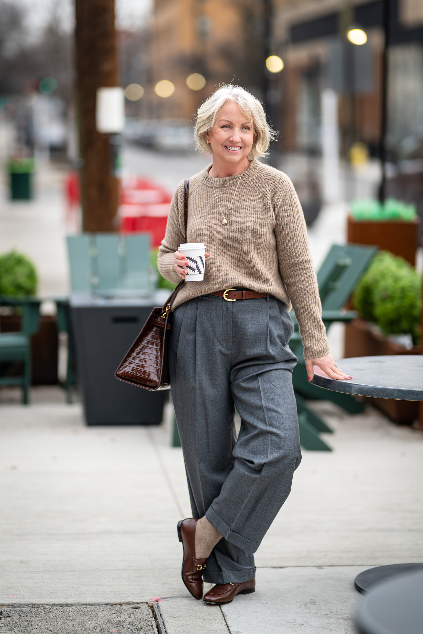 Same vibe for me today – classics in lighter neutrals (I’m wearing a warm ivory top, lighter gray trousers). 🙂 How do I keep my classics from being boring or too masculine? My style angles are classic, feminine, polished, so I’ve built a wardrobe around classics, but keep it feminine with softer fabrics (jersey, cashmere, quality knitwear, lace, etc) and graceful necklines (like cowl or scoop), delicate princess-y jewelry, and my shoes are decidedly feminine, with bows or rhinestones on them. My only pair of loafers is leopard. 🙂 I think you balanced your look well, without the scarf looks lovely, and it would look equally lovely with a scarf.