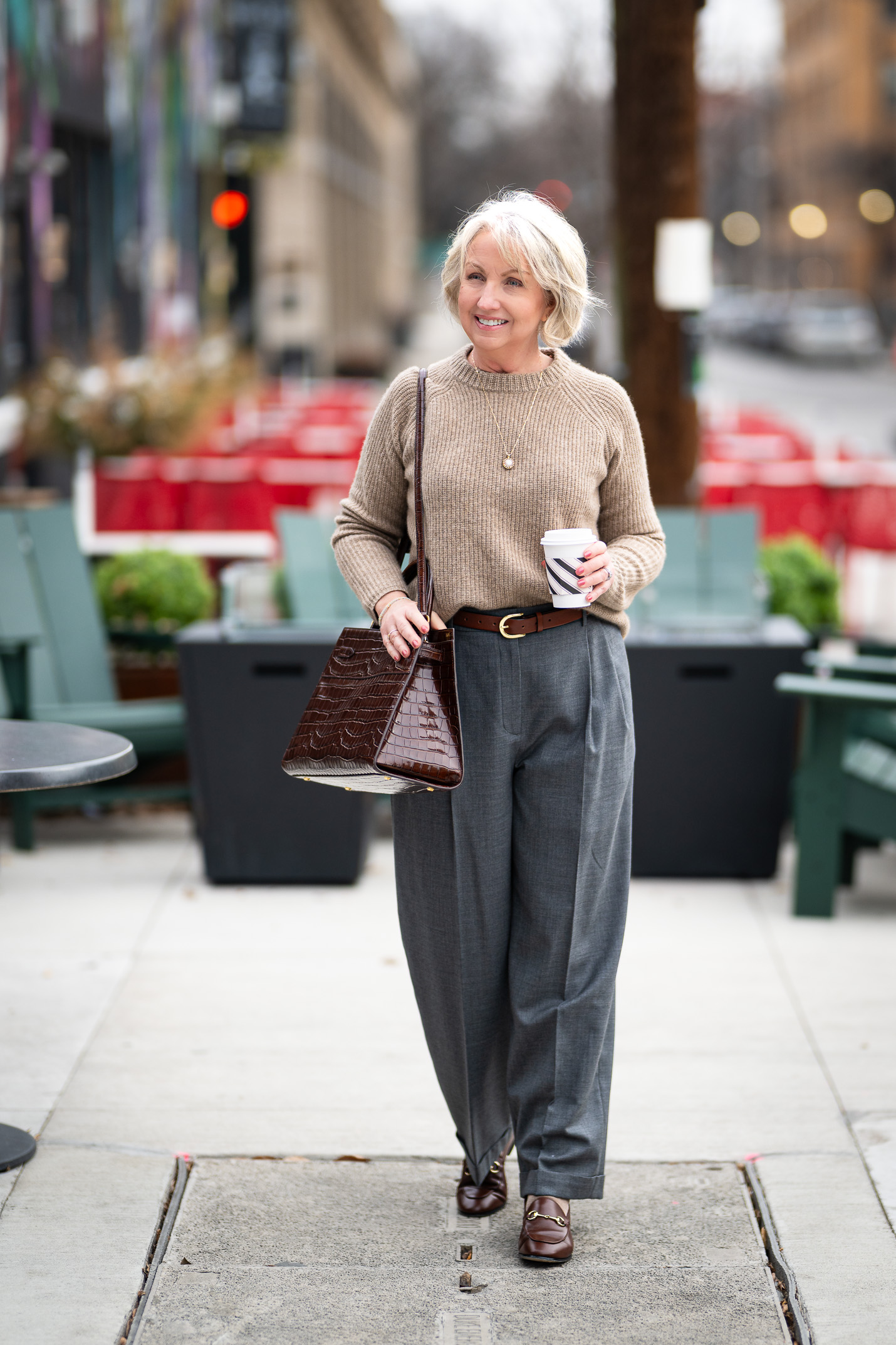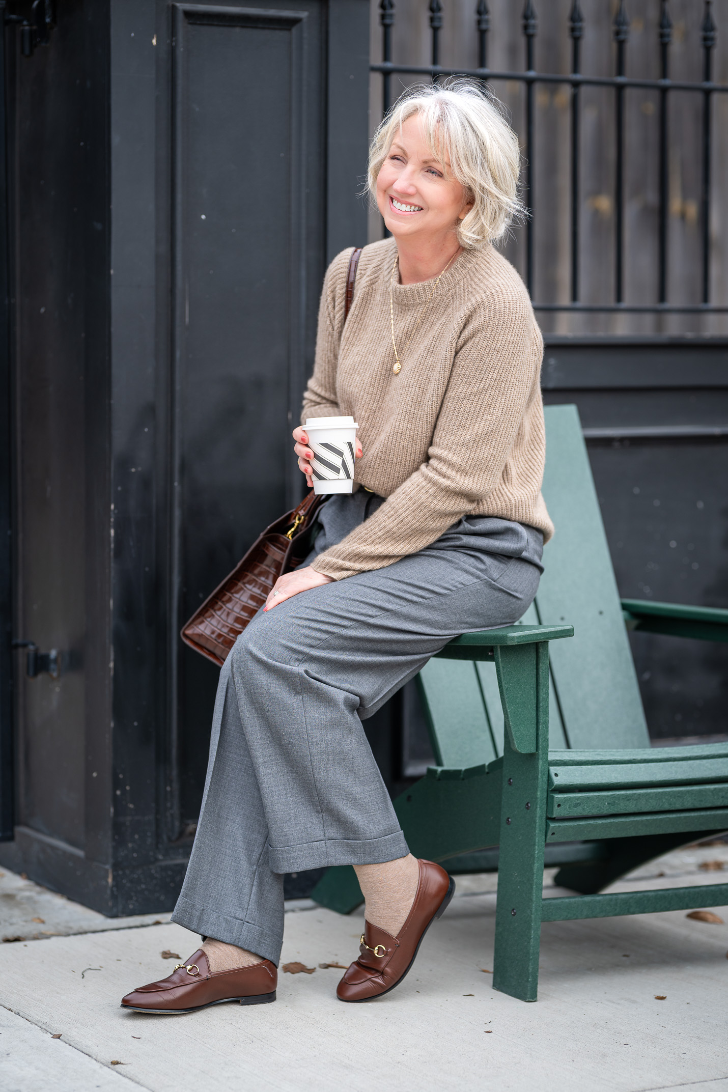 In my timeless, elevated winter outfit I’m wearing a classic trouser in an on-trend full leg silhouette that features menswear inspired cuffs and outward facing pleats. These LilySilk trousers are made beautifully with a machine-washable wool-silk blend fabric that has a smooth, silky hand and dreamy drape. They feature a hidden elasticized waistband in the back to ensure ease of movement through your busy day. These pants , also available in almond and black, will be in my closet for years to come.