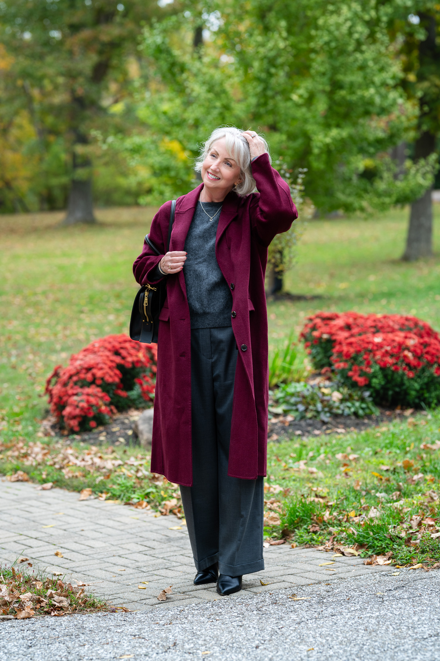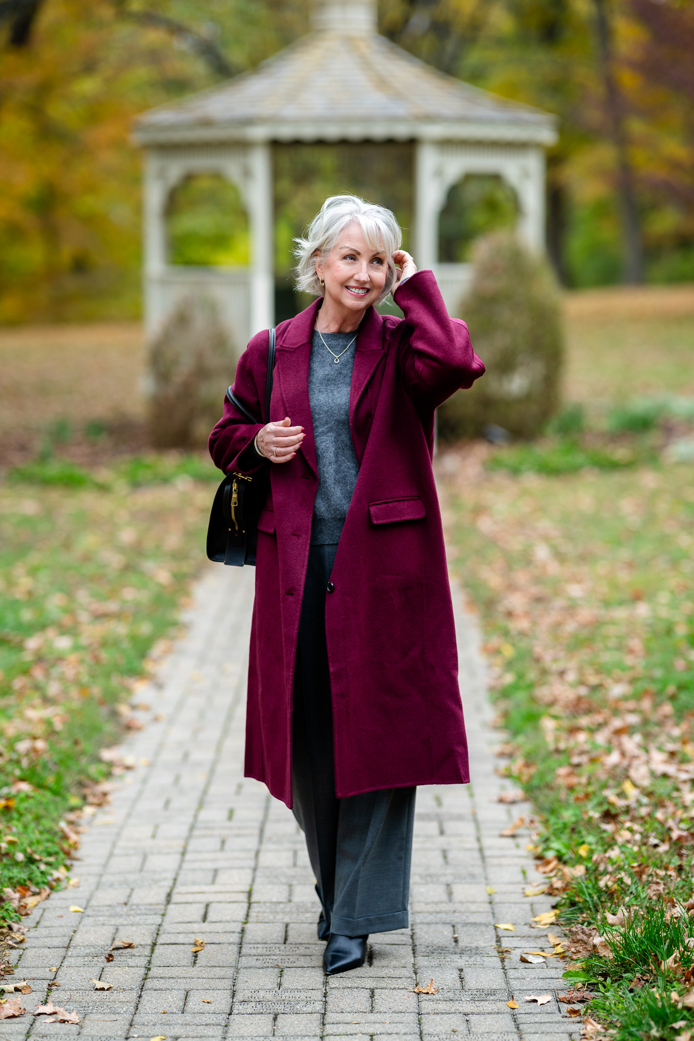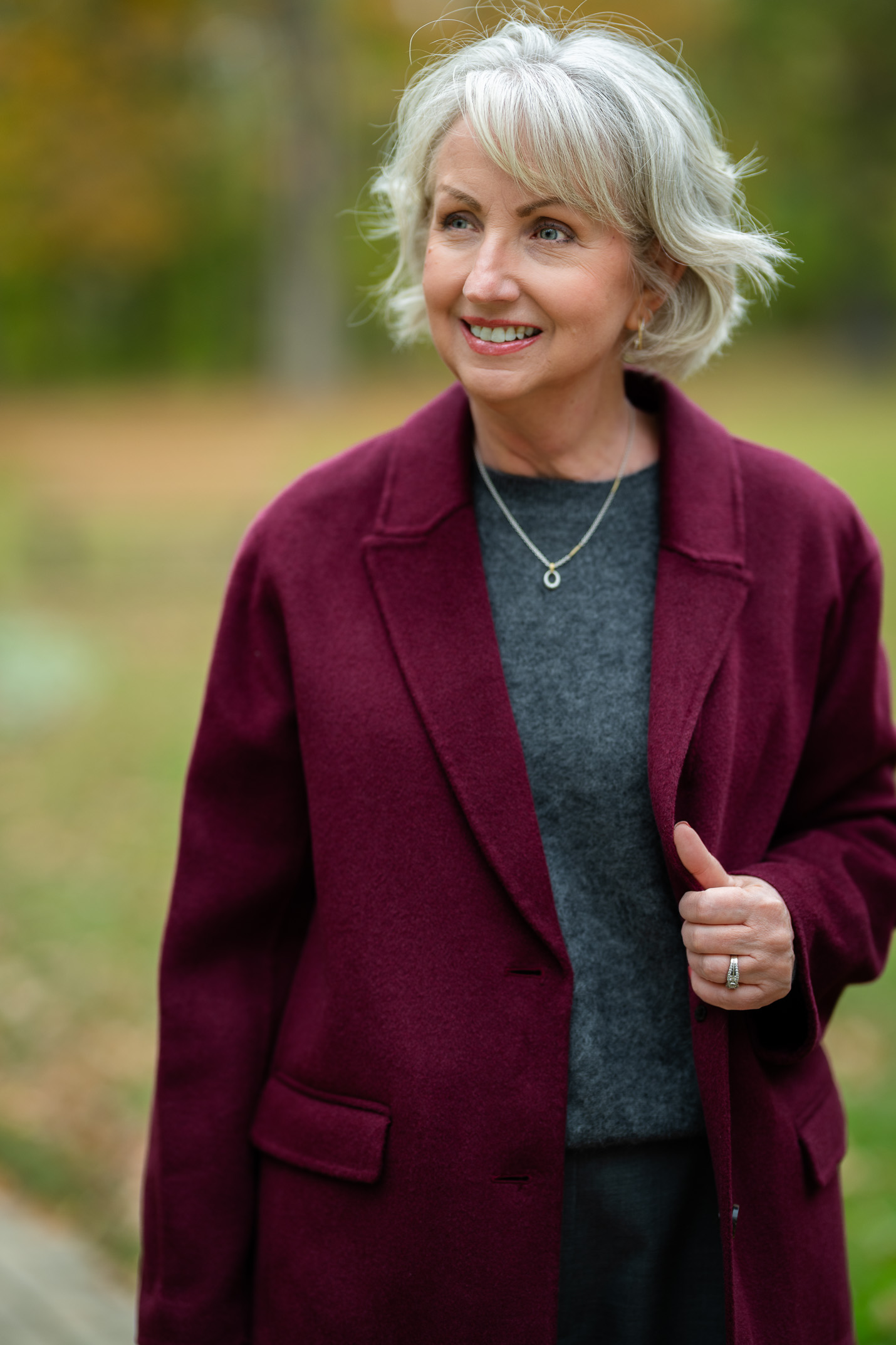 Kay, like lilac/lavender-purples, burgundy-reds are your color! That coat looks stunning on you!!! That same coat in the “natural” would also look amazing on you, with one of your soft-white/tan monochromatic outfits. Love your elevated everyday style tips. Great BFMD!