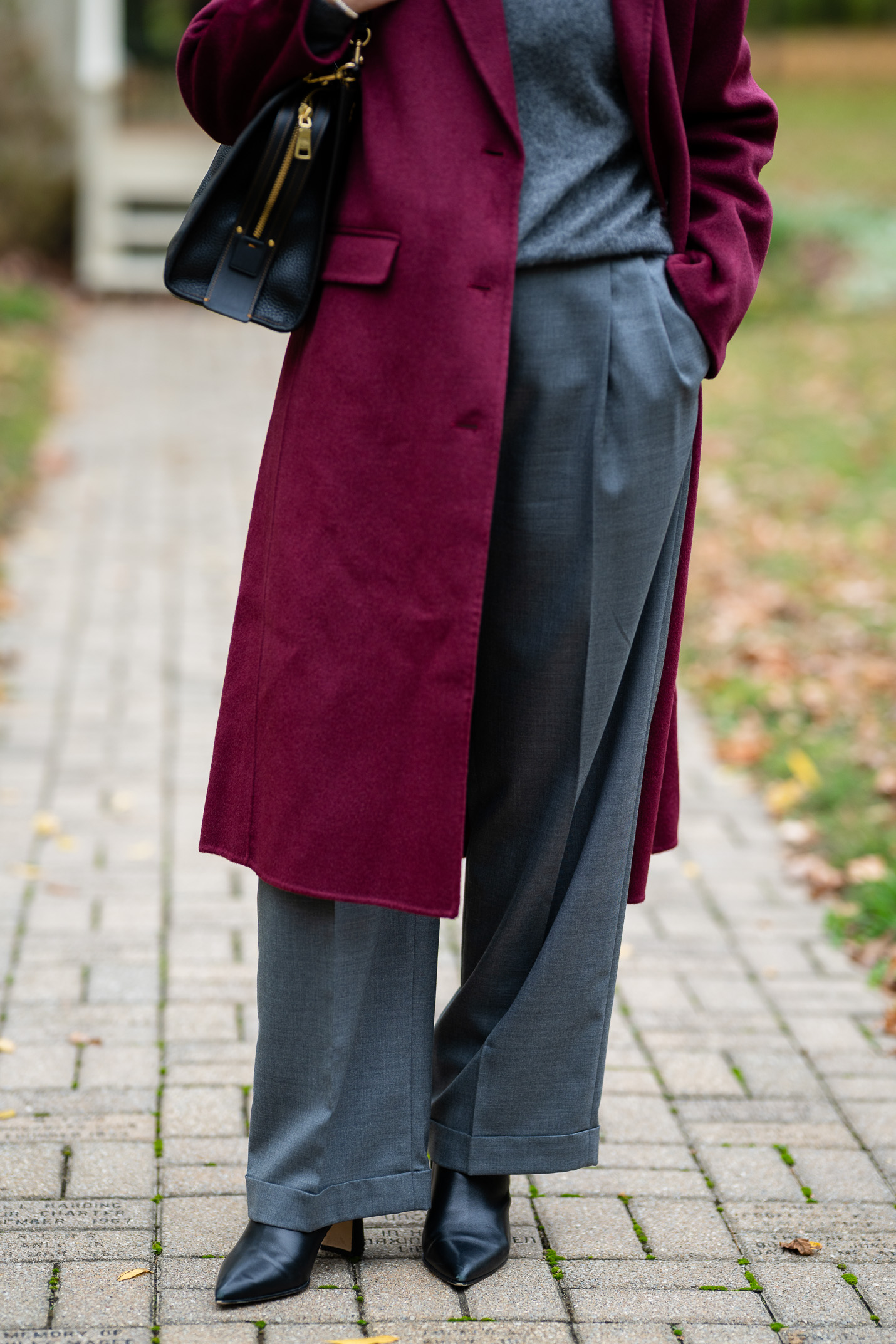 Choose your accessories to coordinate with your column of color outfit the best you can with the limitations you have. You don’t need to assume that you can’t create a column of color with those striking navy trousers and navy sweater just because you don’t have navy shoes, for instance. Here I’ve worn black booties and carried a black bag with my column of grey under my Wilshire red coat.