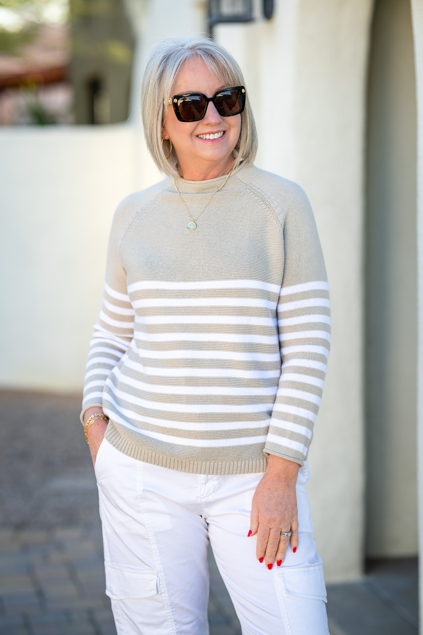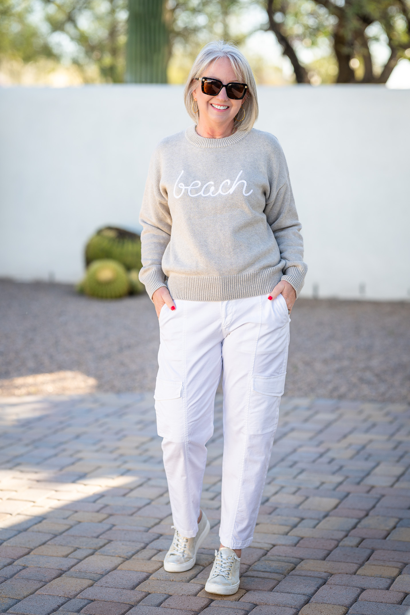 I’m a big believer in taking along a cotton or cotton and linen blend pullover sweater on any spring or summer vacation. It may seem counterintuitive, but anytime I leave this vacation outfit essential at home…I regret it.