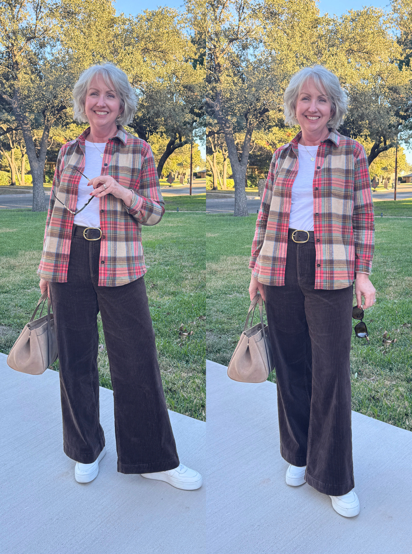 My rich coffee corduroy pants from Lands’ End are so comfortable but modern and fun, too. For a day of visiting with family I topped them with a simple white tee and my L.L. Bean flannel shirt. I tried on the boots with this outfit, but in the end decided the sneakers were a better option. I did complete the look with a brown belt. And my Michael Kors purse proved to be a worthy choice for the entire trip. It matches perfectly with my booties, so it felt like a smart choice.