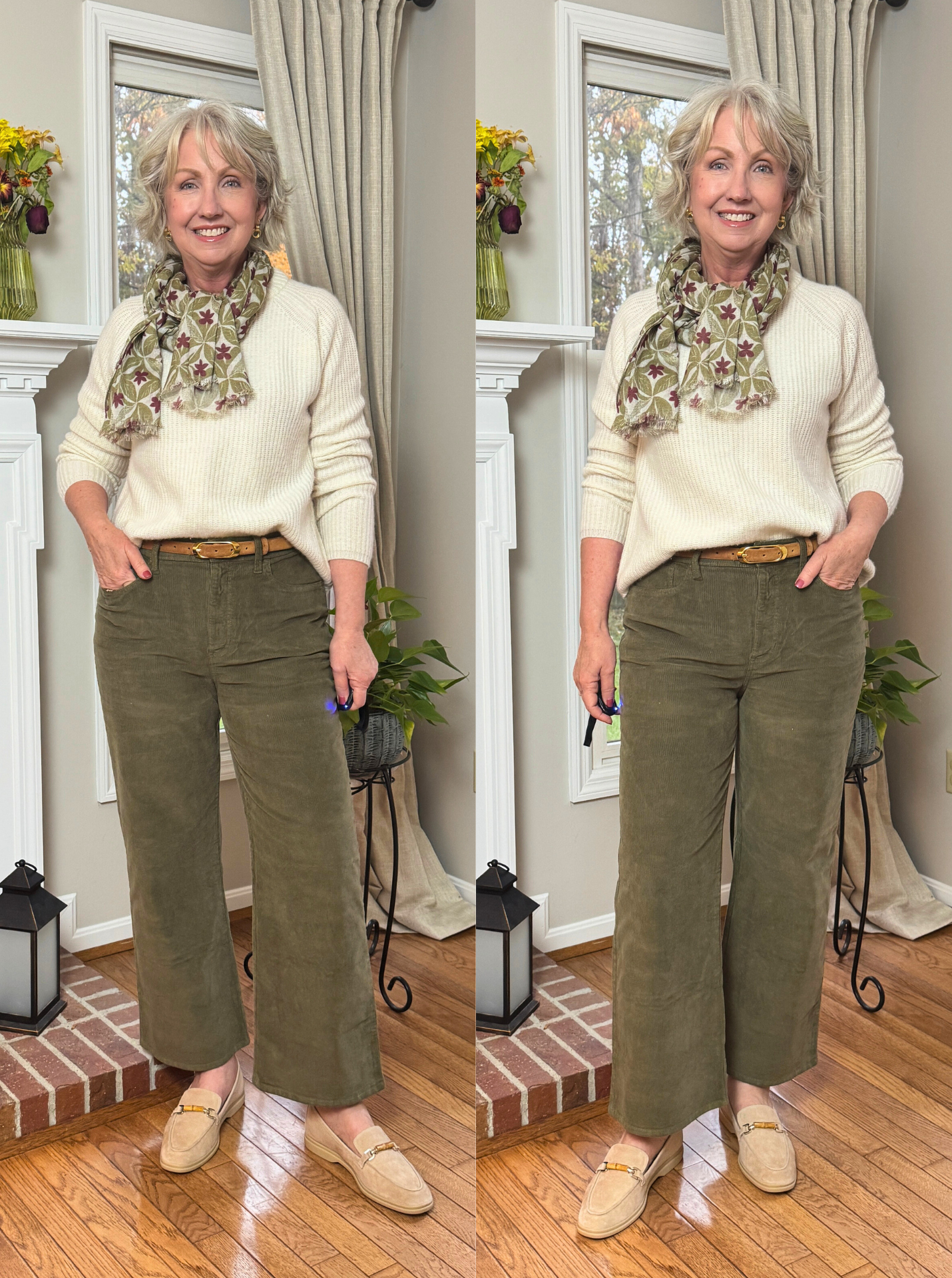 I introduced these frosty olive corduroy pants in this Wednesday’s YouTube video, which was my first ever fashion haul unboxing. I was anxious to style them so I worked on that a bit that morning. I ended up with what I felt was a classic pairing of ivory and olive. And then I realized this new leaf batik wool scarf works with the pairing beautifully. I pulled the outfit together with a gentle front tuck and a belt.