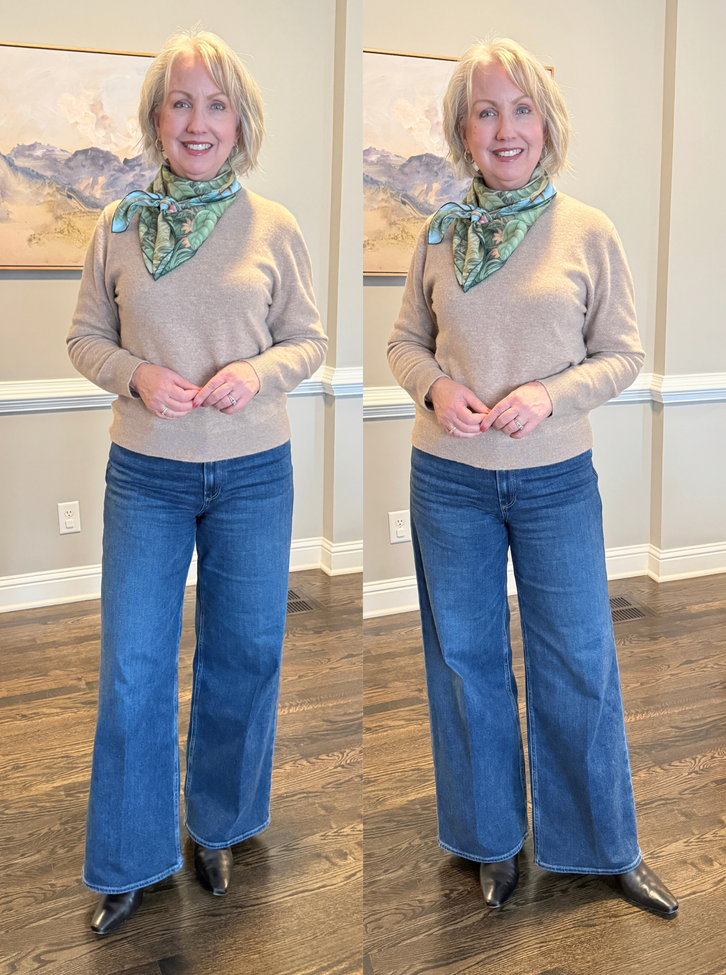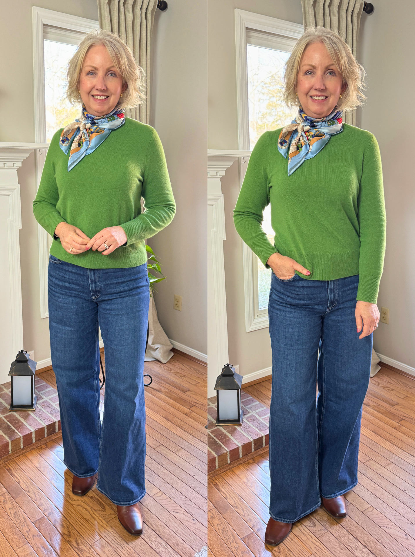 I decided on a pair of darker wash wide leg jeans with a favorite green pullover cashmere sweater. I’d gotten in this new Kate Spade scarf the day before, so decided to take it for a whirl. It was a messy day, so I wore my Easy Spirit booties.