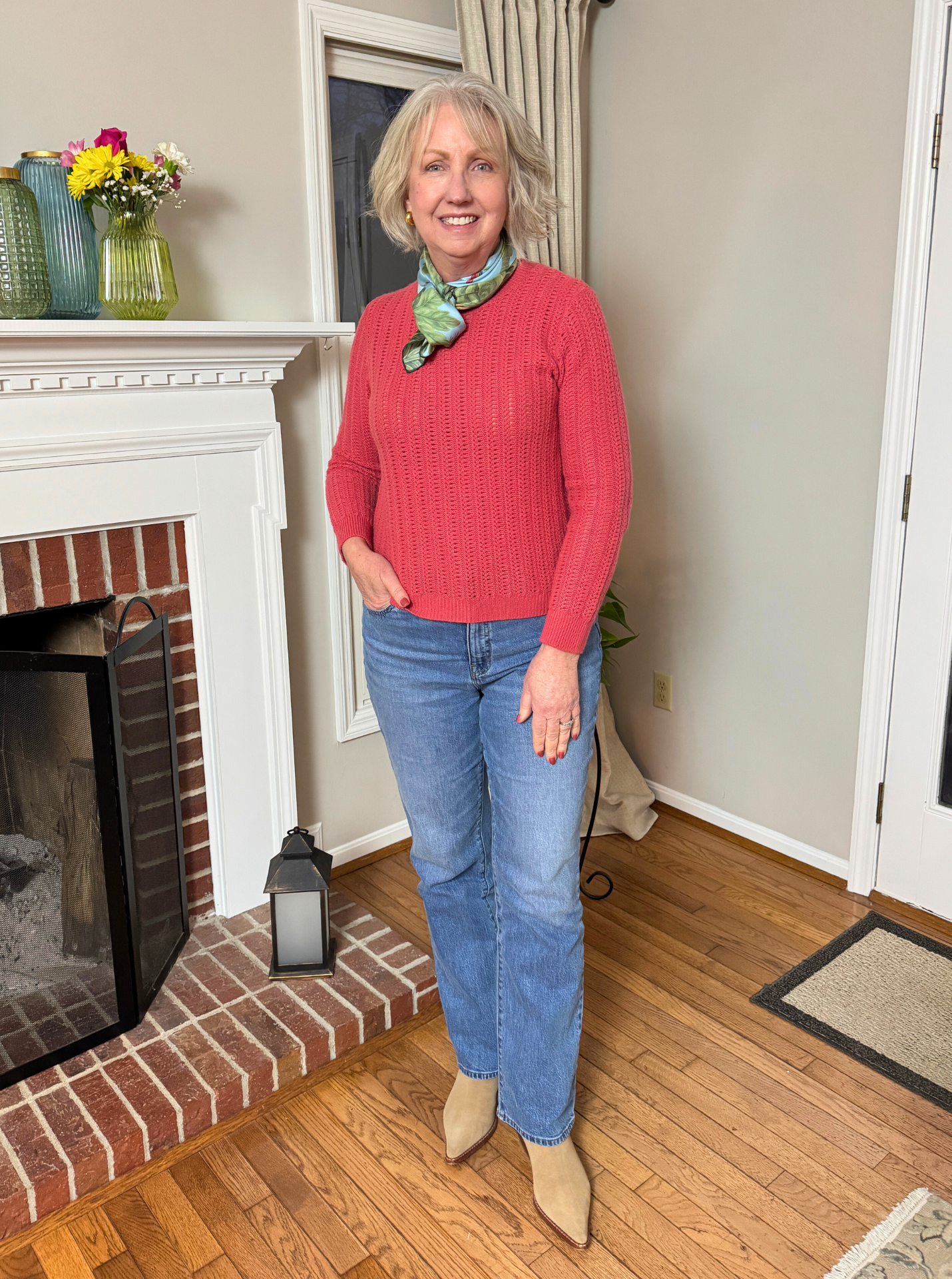 After lunch I rode back “home” in the back seat with my granddaughter to keep her awake. We needed her to get in her full nap in her bed. Ha! While she napped, I had a video conference call with two of my blogger friends and then did a little work. I enjoyed wearing my Paige jeans for a second time this week. And my Quince cashmere sweater served me well with a silk scarf. I love that you can turn a scarf to a different side and get completely different colors.