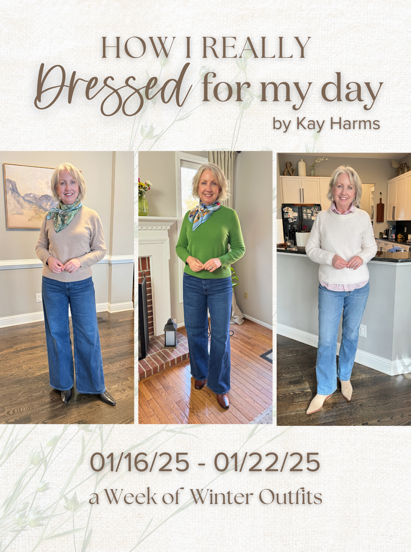 Welcome to the doldrums of winter. Amiright? This is about the time I tire of trying to put together unique or new winter outfits and instead settle into enjoying my favorites on repeat. Favorite pieces, favorite outfit formulas, favorite coats and favorite accessories. So as I run through my real life outfits from this third week of January you will indeed notice some repeats. But I wear them proudly. Here’s how I really dressed for my day this week.