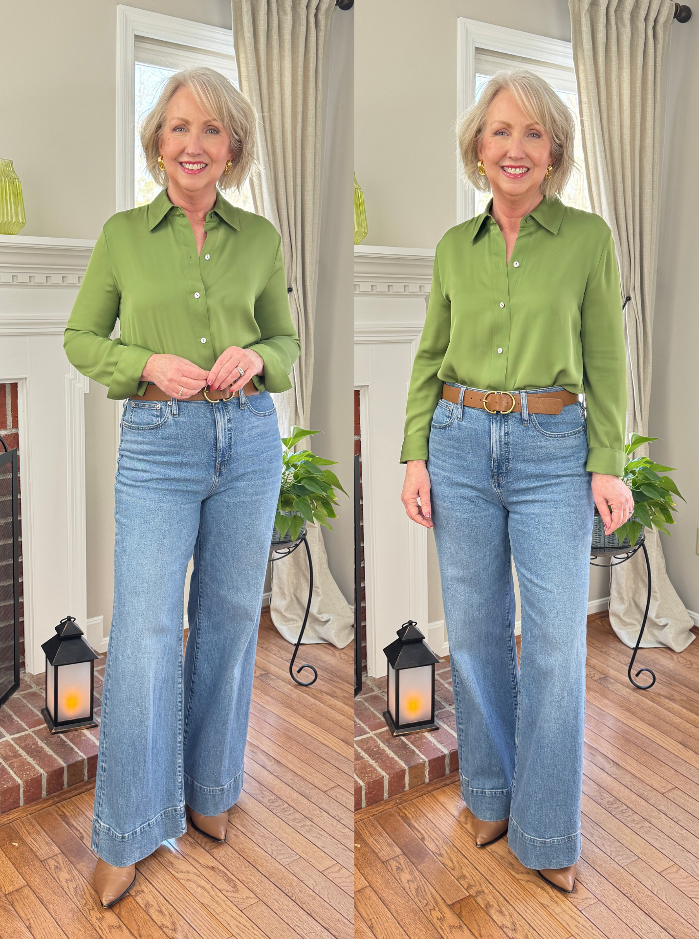 Just love that green silk blouse on you! Happy Valentine’s Day to you!