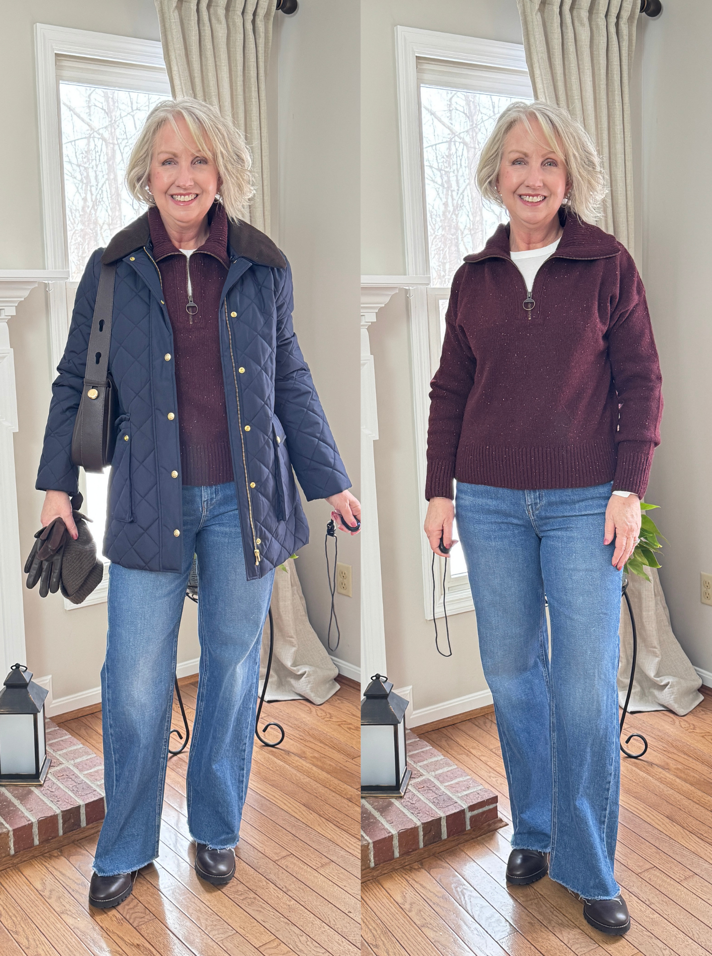 I wanted to look a little polished and pulled together, but I did have to shovel snow. So I layered on a long sleeve tee with my quarter zip sweater (marked down + get an extra 20% off with code EXTRA20). I wore my waterproof boots so I could navigate the icy parking lot at the theater.