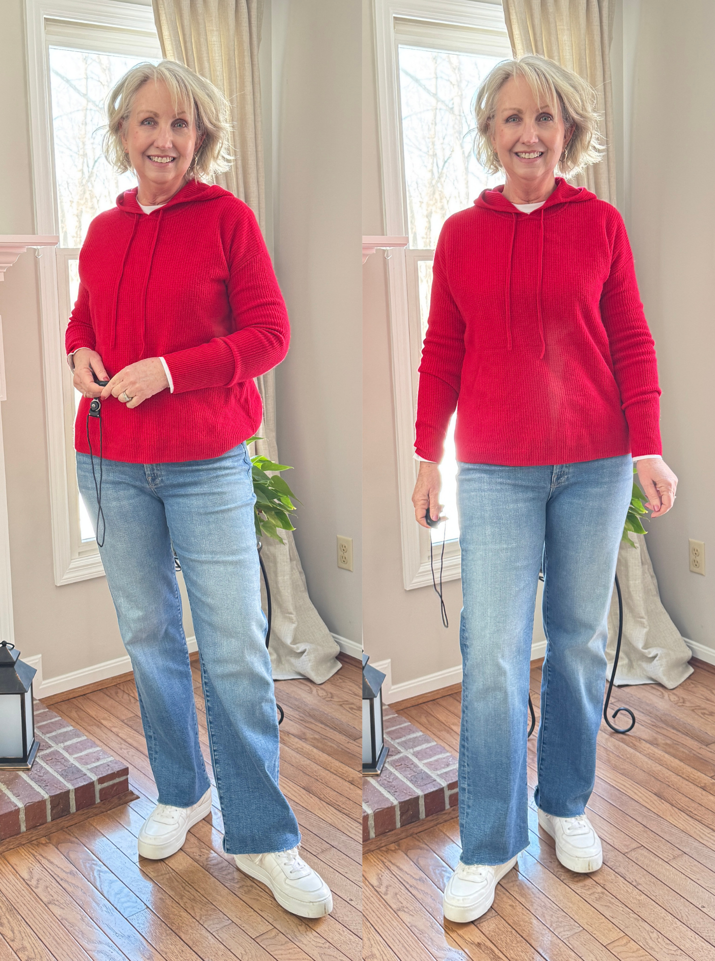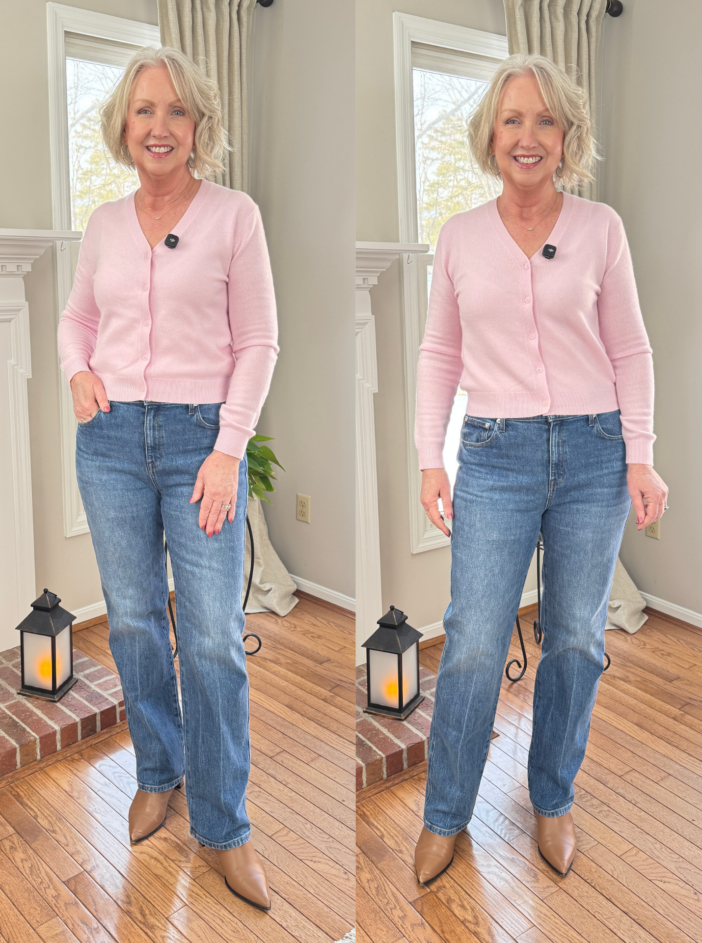 This soft pink, cashmere, v-neck cardigan sweater will serve me well through the spring. It comes in other colors, too. I’d just received the Ayr jeans and couldn’t wait to wear them or to show them to you. I featured them in Wednesday’s video – such a classic. Alas, I ended up trashing the video I shot that afternoon and we reshot on Tuesday.