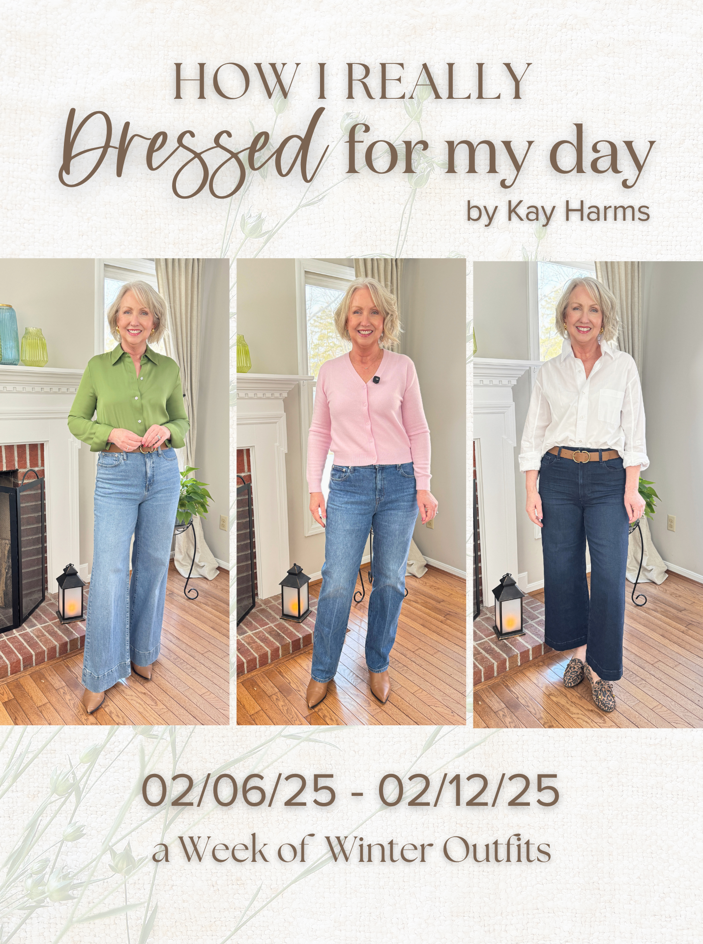 Kay…. I know you’ll know when it’s time to cut back but when the videos get too hard to prepare weekly you can give yourself grace to cut back and maybe do monthly???? I love your videos and seeing them weekly, but you want to continue feeling good each week. Love seeing what you really wear for your week. Love the silk blouse and denim outfits. So classic and you look great in trouser jeans.