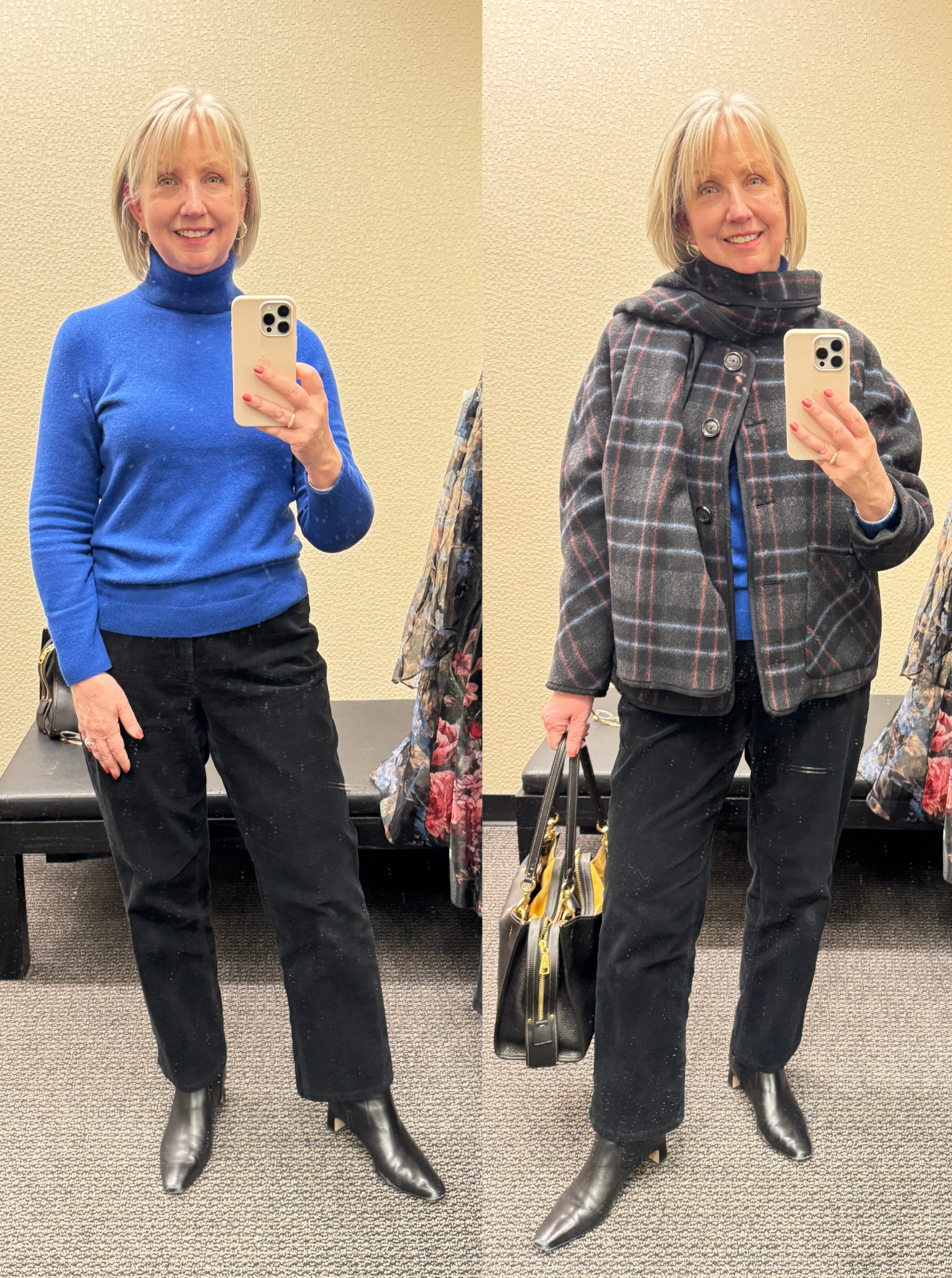 I didn’t put on anything interesting Thursday, just activewear I wore to take a walk. But Friday I had three appointments, so I decided to get a little more dressed up for my day. I wore my trusty Spanx corduroy pants with a faithful cashmere turtleneck. I wore a plaid scarf coated gifted from Veronica Beard over it. But really the photo below, taken in a fitting room mirror, is really a lesson in how not to get dressed for your day. Ha!