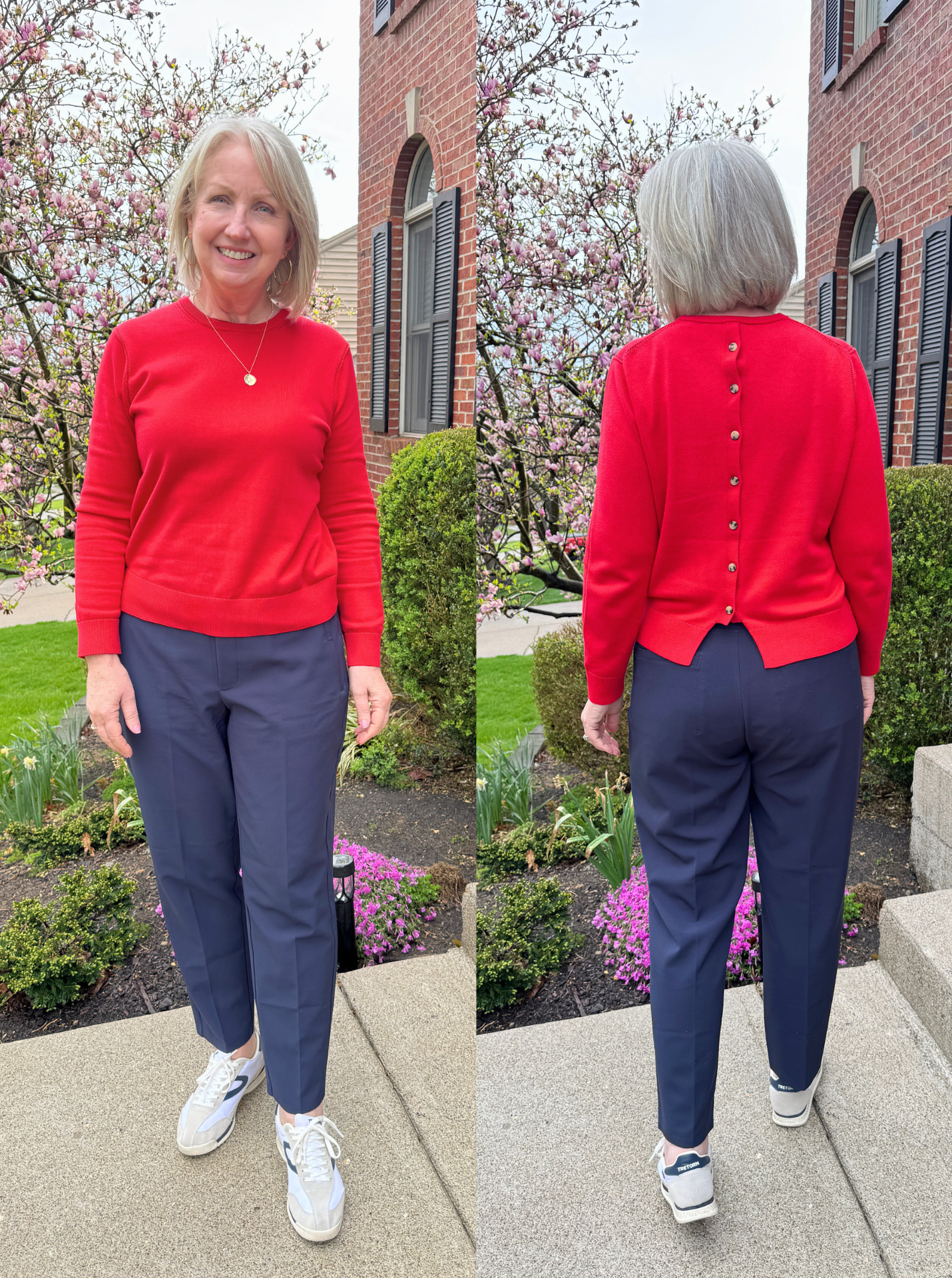 Beautiful outfits on you. I really like the raspberry sweater so pretty. The red sweater with the button detail in the back is so unique and pretty too. You will look stunning in England.