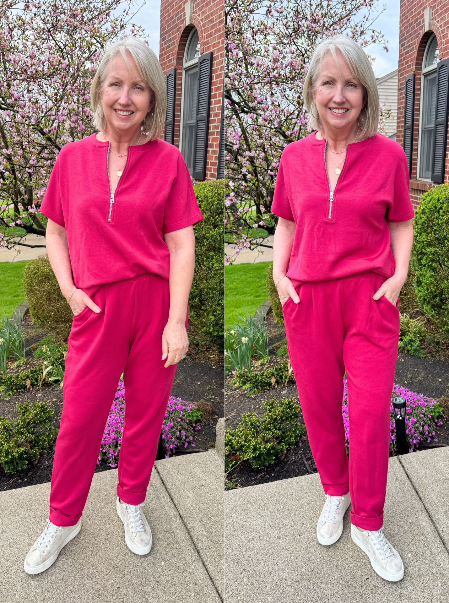 Saturday I worked around the house catching up on this and that. So basically it was a day of light housework. I had gotten in this new set (sold separately) from Varley and was anxious to give it a go. This proved to be the perfect day for the rich raspberry rolled cuff pants and coordinating half zip sweat top.