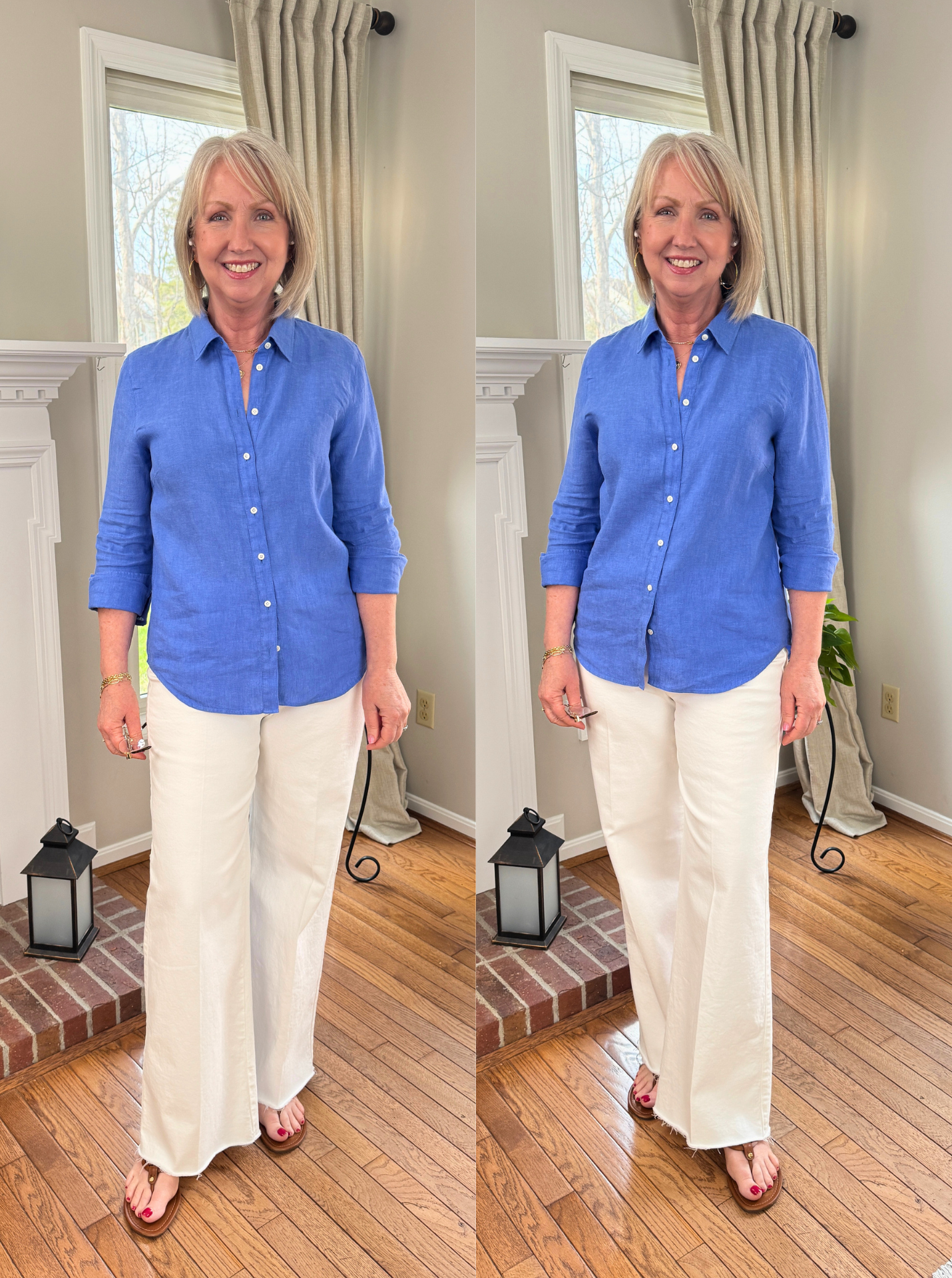 Monday we recorded a couple of YouTube videos, so I actually changed clothes multiple times. But I ended up in these Paige Anessa jeans with a pretty French blue linen shirt.