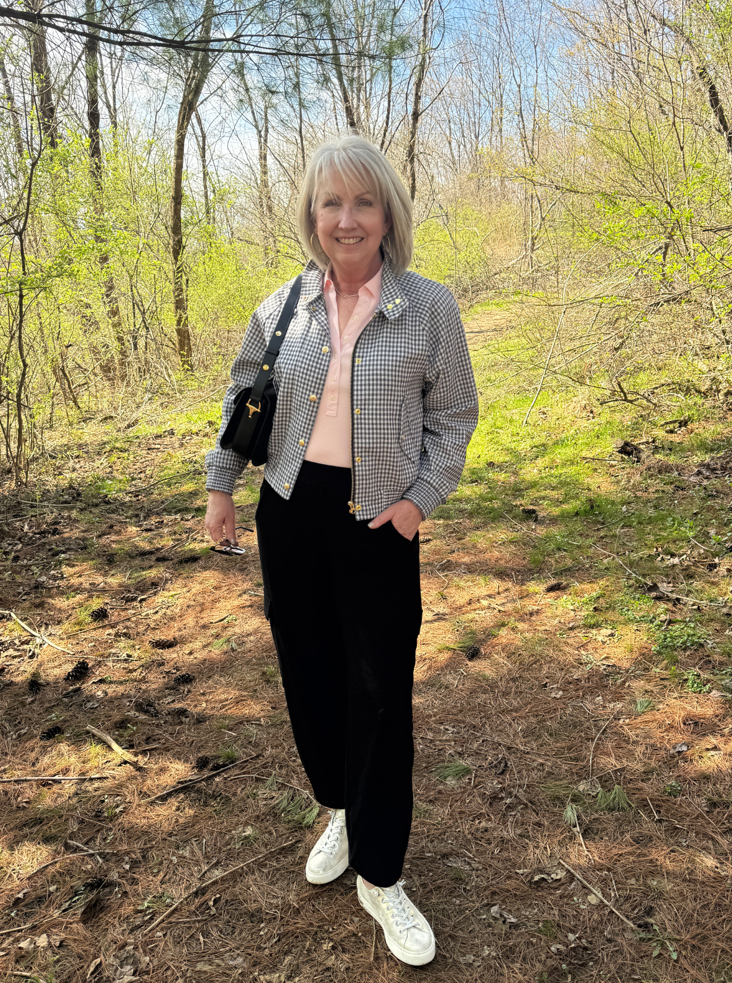 I’d chosen this outfit with that agenda in mind. I thought it would look pretty and springy, but also work for a brisk, easy walk. I’ve had the stretch crepe cargo pants for at least a couple of years and they are almost sold out; in fact they are gone in the black. And my jacket is from last year as well. But that pink polo top is a new favorite find and I have a feeling I’ll be wearing it frequently through the summer. It fits true to size.