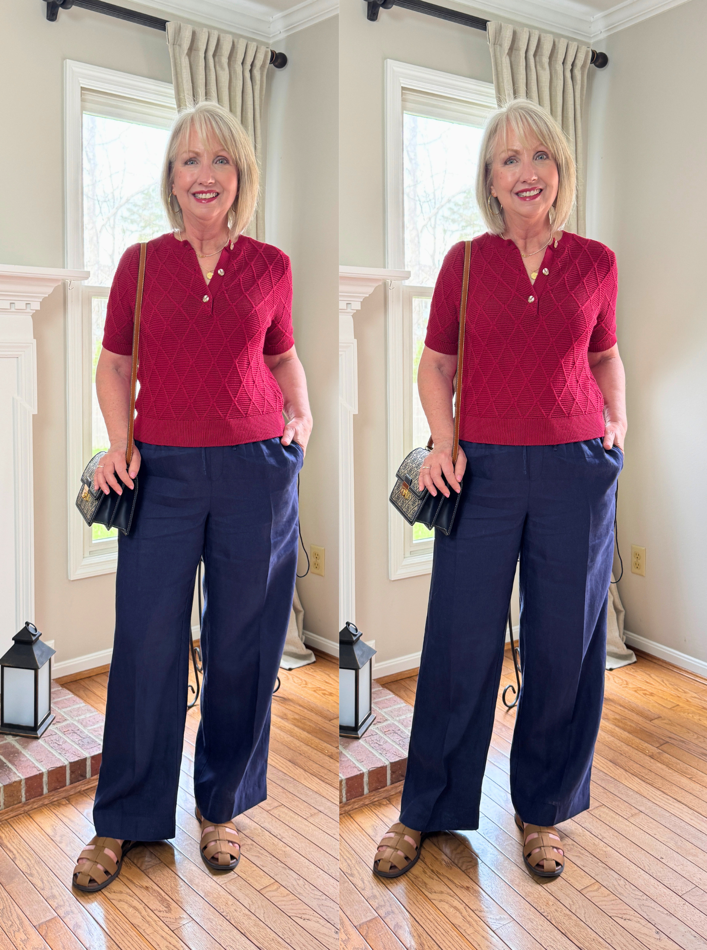 I had worked around the house and taken a walk, so I was pushed for time when I got dressed. It was quite warm outside, so I knew I wanted to go fairly light. I ended up just throwing back on the sweater top with a pair of navy linen pants. I completed the outfit with Rothy fisherman sandals and my navy Tory Burch bag.