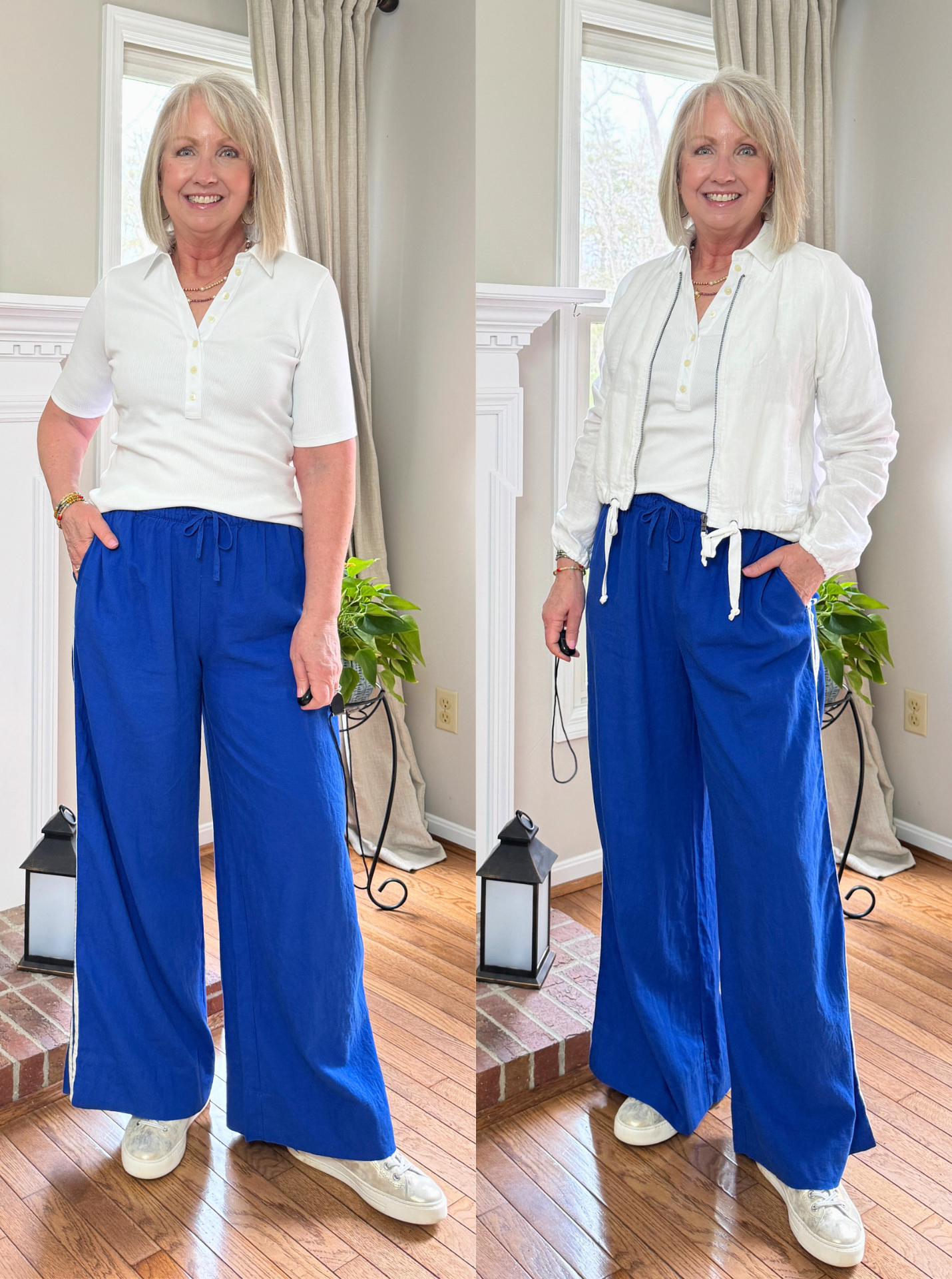 These bright blue linen track pants are super comfortable and so cheerful. They actually have a coordinating top, but I did not order that. I decided I’d be more prone to wear them with a simple white top, and this ribbed polo fits the bill perfectly. I topped it with the linen jacket when I got a little chilled, but also wore it without.