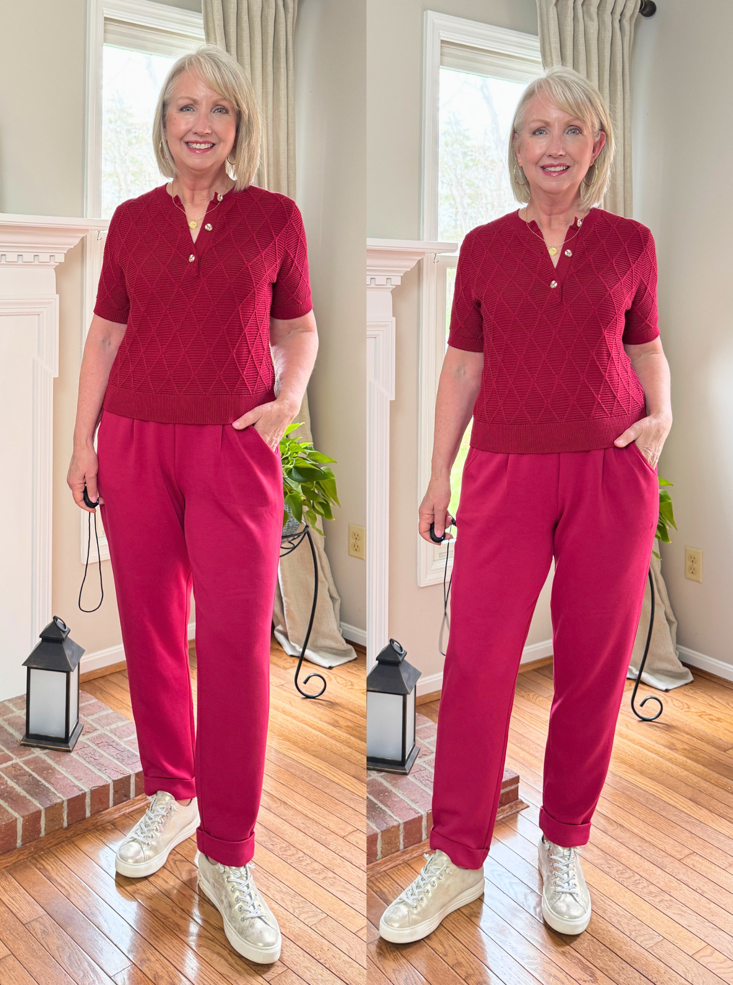 I do indeed like the look of this rich raspberry diamond knit 100% cotton top with the coordinating pants. In fact, I think it makes the outfit look a little more elevated. This is one I will definitely wear to run errands or for a casual outing. I’m wearing my true size medium in the top.