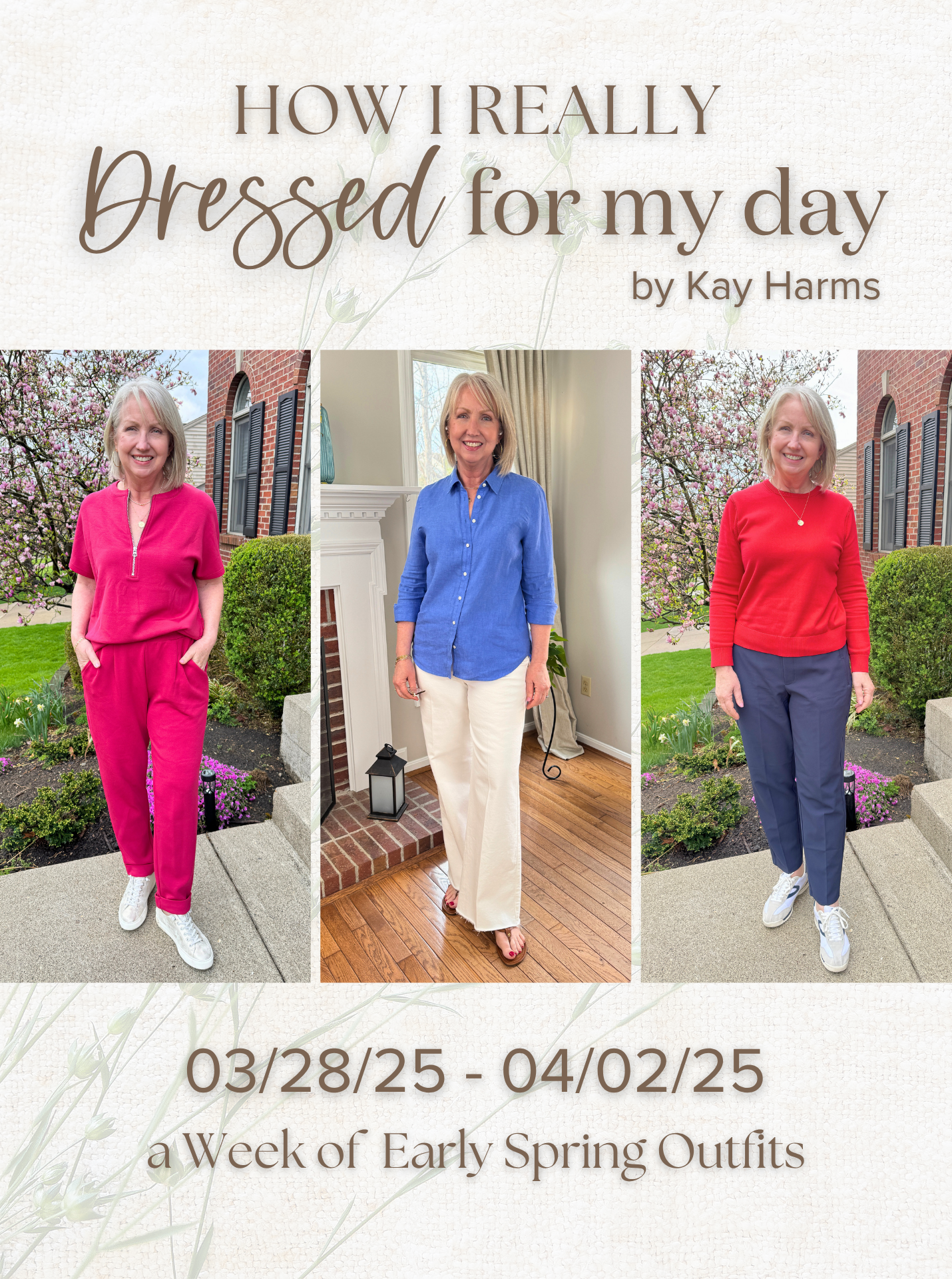 I love all the bright colors you wore this week. I suffer from chronic depression and spent many years in my pajamas not taking care of myself. Now, as I’m doing better, I get dressed to look as nice as I can in comfortable clothes. I love clothes, but my husband and I live on our Social Security income. Most of my clothes come from Poshmark, but I’ve lost nearly 100 lbs in the last year and it has gotten much easier to find Talbots and J. Crew clothing on that site. You give me inspiration! I have a really nice pair of J. Jill ecru jeans headed my way right now. My clothes are mostly worn at home or for doctor’s appointments. I average 2-3 a week. Talk about depressing! I hope you have a good weekend celebrating the resurrection of our Lord and Saviour, Jesus Christ.