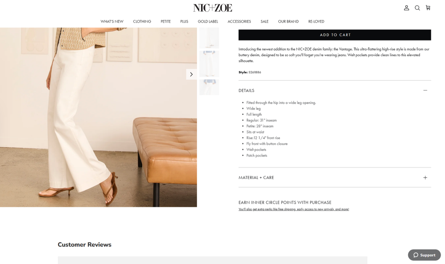 Below you can see the rise for the white jeans I modeled above, which are the 31″ Vantage Wide Leg High Rise Jeans from Nic+Zoe. I imagine this information is hard to see on a cell phone, but you should be able to see it clearly on a computer screen. Mainly, I just wanted you to see where you’ll be able to find this information in a retail listing. As in this case, you may have to “open” the Details or Fit tab to see all the numbers. These jeans have a very pleasing (to me) high rise of 12.25″. But if you prefer a mid to low rise, these would not be the jeans for you.