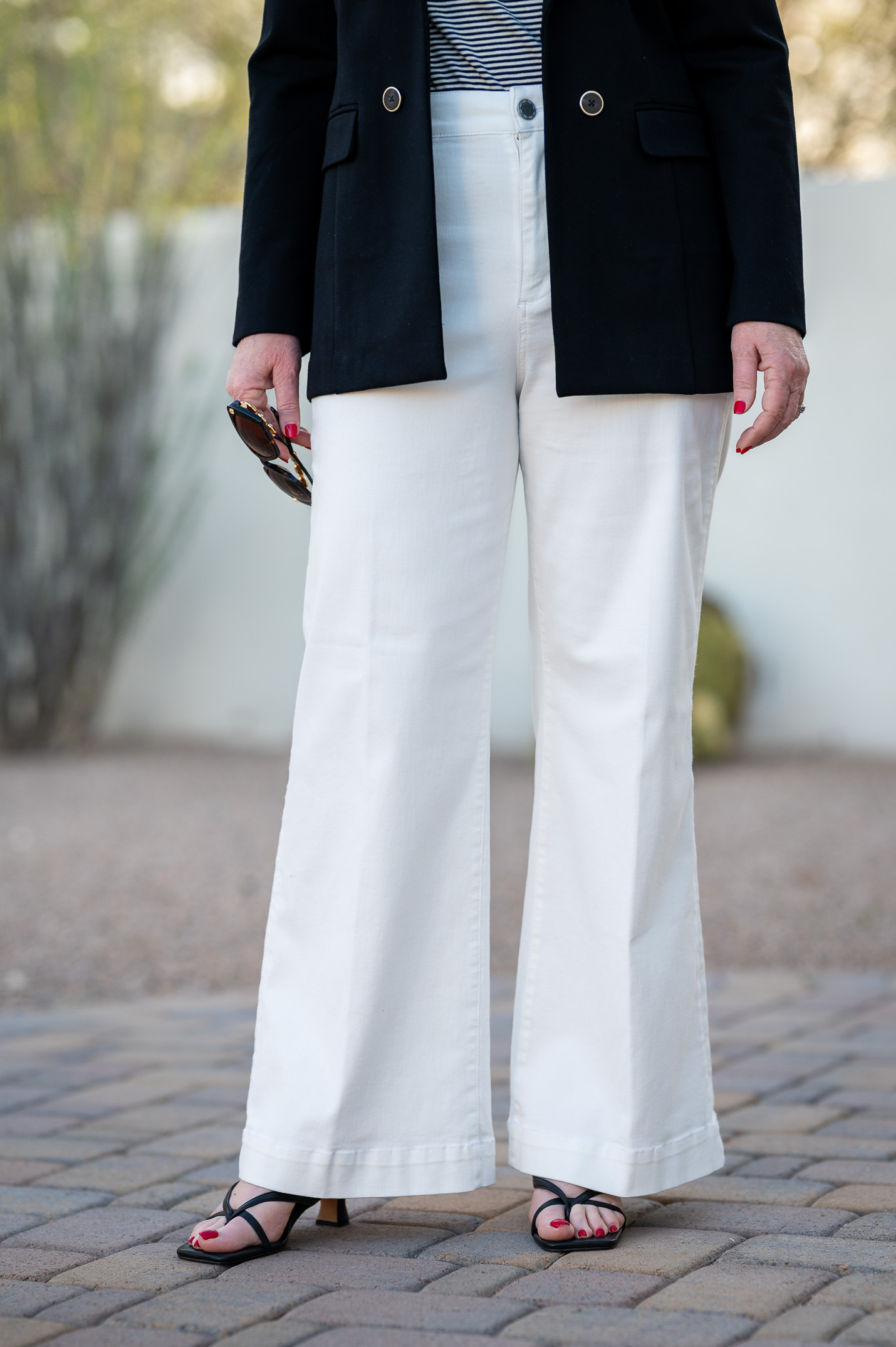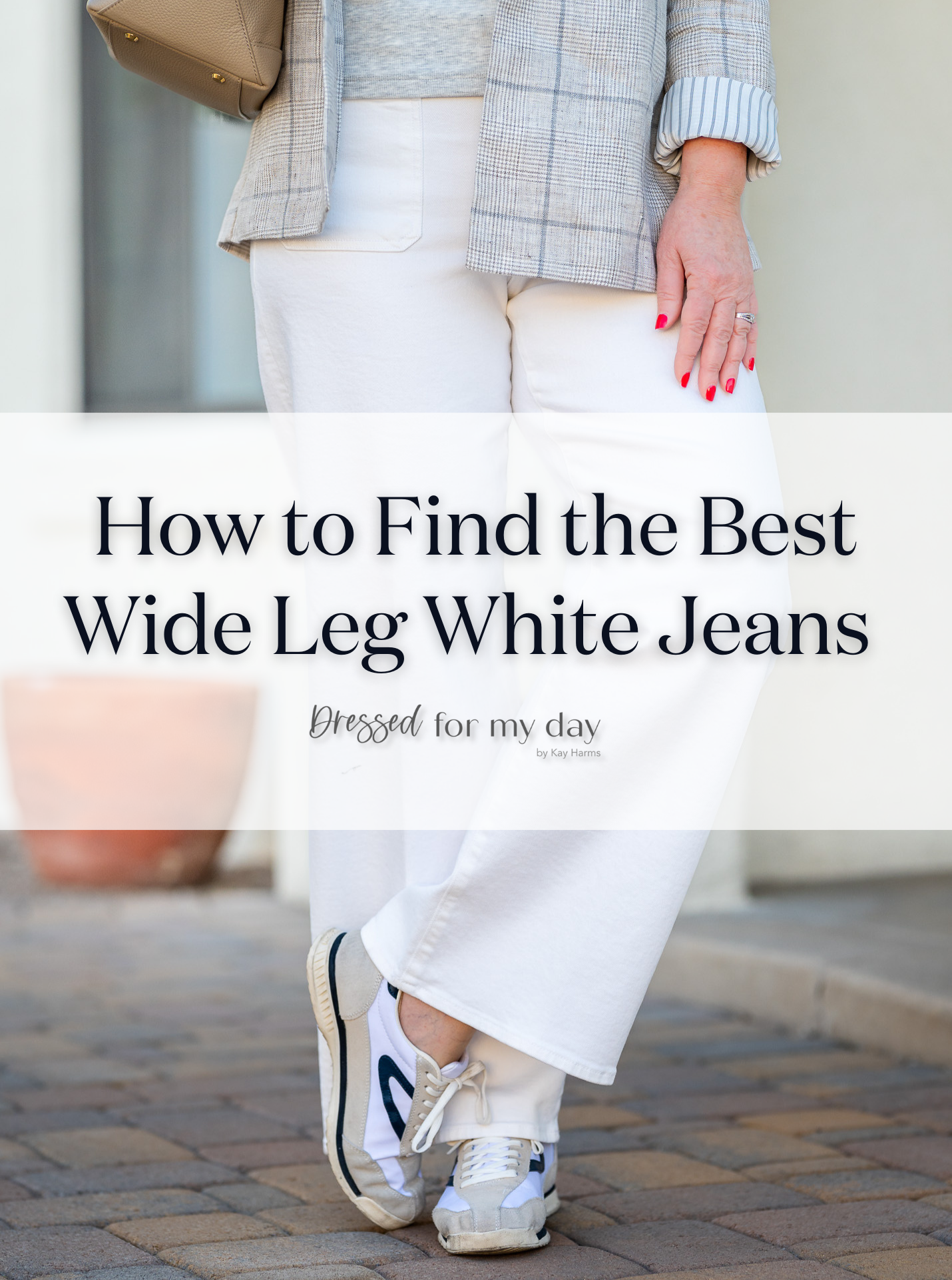 Shopping for jeans is hard enough, but looking for white denim for spring and summer takes the challenge to a whole different level. Some might say this elusive pursuit is right up there with trying on swimsuits. Ha! Well, maybe it’s not that hard, but it certainly can take the wind out of your sails to try on pair after pair of white jeans only to come up empty-handed. Today I want to take the mystery out of the hunt. Not only am I giving you some pointers for how to find the best wide leg white jeans for you, but I’m also sharing some of my favorite brands to check out.