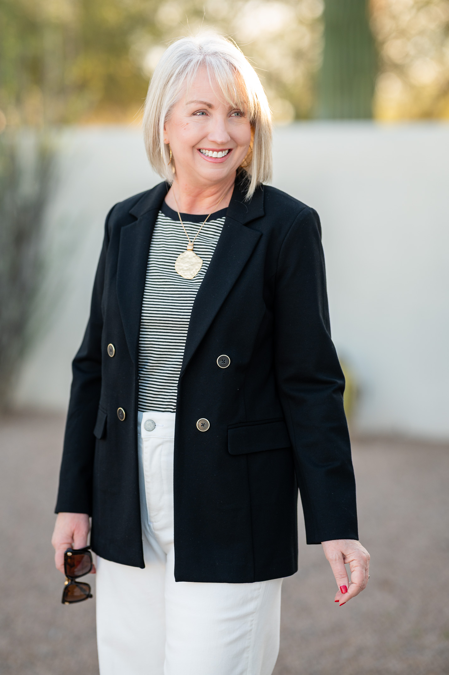 In 2026 we’re seeing a resurgence of the crisp white jean. However, you’ll still see plenty of ecru or off-white jeans to choose from, too. Here’s a practical exercise that will save you a lot of frustration. Do you have striped tops in your wardrobe? Check to see if those shirts, sweaters and tees include a white stripe or an off-white stripe. If you’re planning to wear those tops with your white jeans, that will help establish whether you should add true white denim to your closet or if you should look for a softer white.