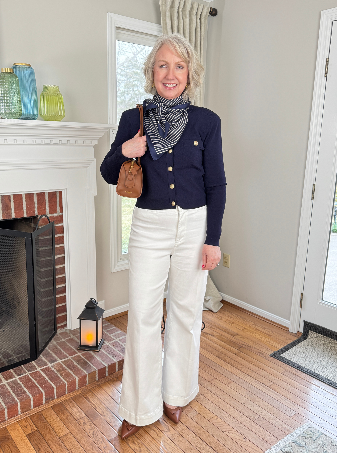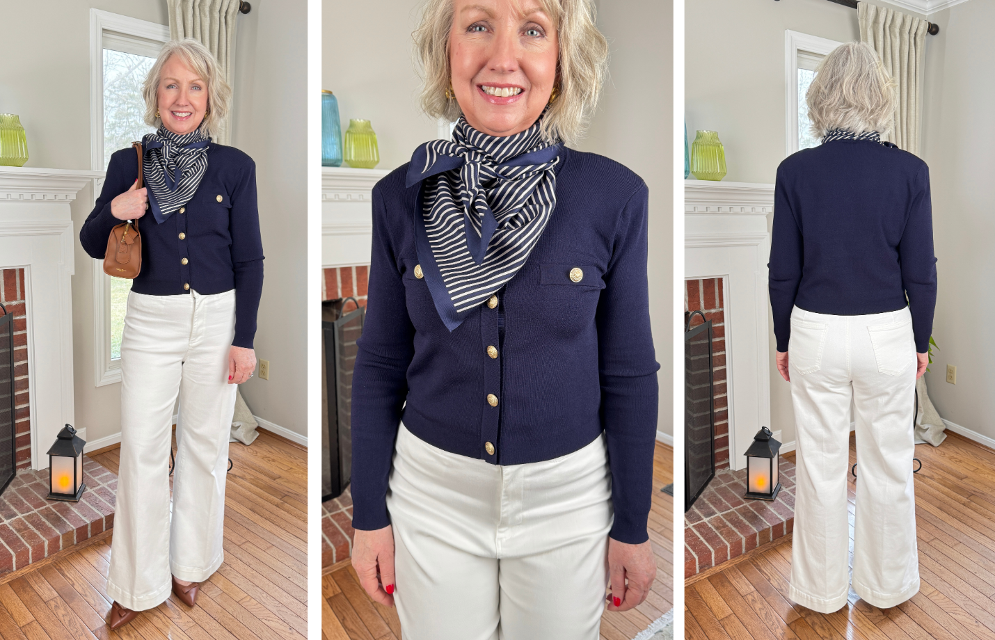I love the navy cardigan with the scarf and white pants. You look so sharp. I’m really into blues and navy. I like your hair too. The devotional message is spot on. I need to remember that.