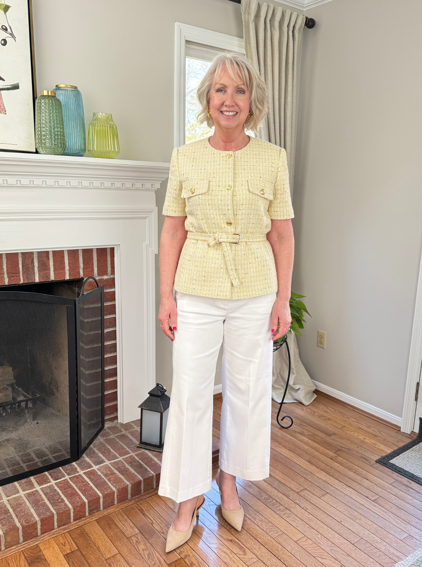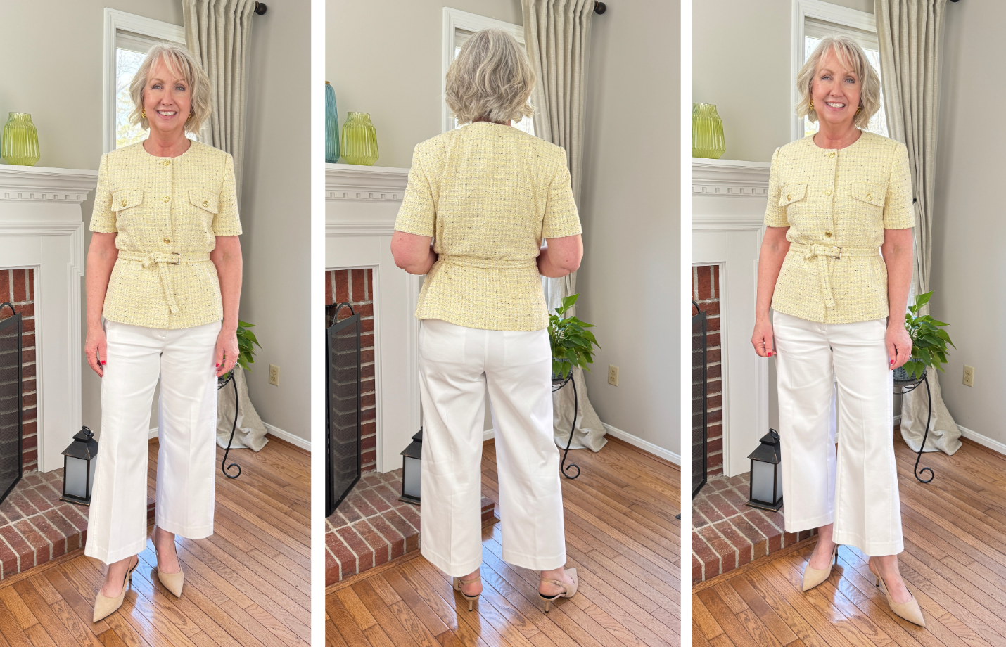 Above and below I’m wearing the Ann Taylor Grace pants with a tweed belted jacket in a lovely speckled yellow multi. Yellow isn’t usually my best color, but I do love this belted jacket so I’m adding it to my wardrobe. It fits nicely true to size and can be worn multiple ways. For instance, on the website they actually show it with blue jeans.