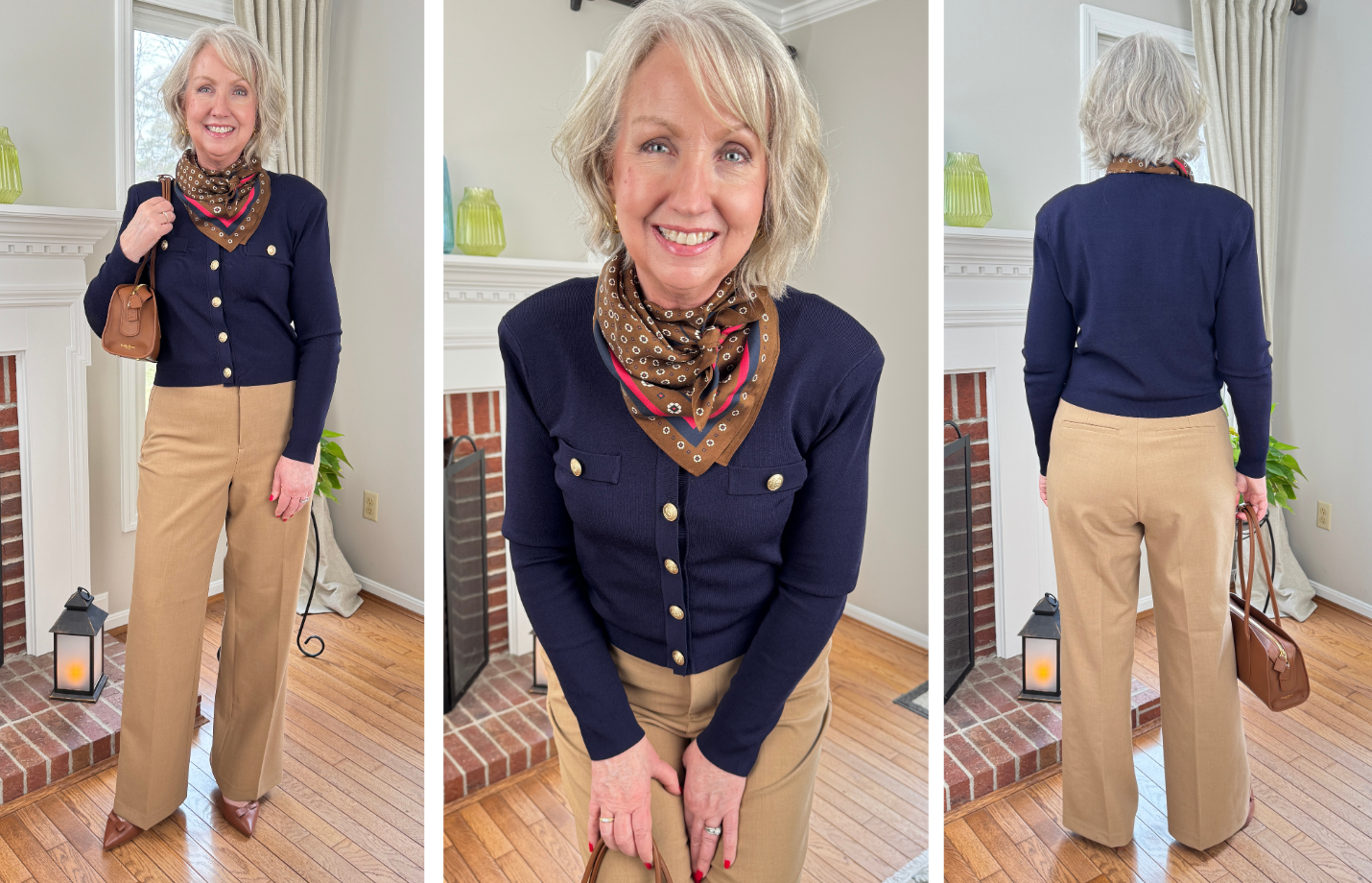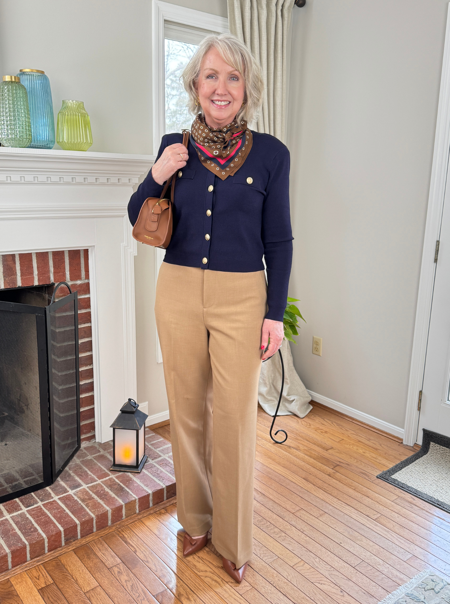 Above I’m wearing the Spanx pants with the Toulouse knit cardigan in navy from L’Agence. I sized up to a large per the size chart for a beautiful fit in this exquisite, classic jacket/cardigan. I love the luxe knit and the gold buttons. It does have padded shoulders, too. Unfortunately the midnight navy is almost sold out, but it does come in ivory and black options, too. This piece is definitely staying in my wardrobe for elevated looks. I topped it with a pretty silk scarf and completed the look with my Sarah Flint slingbacks and this beautiful Parisa Wang East West bag in brown.