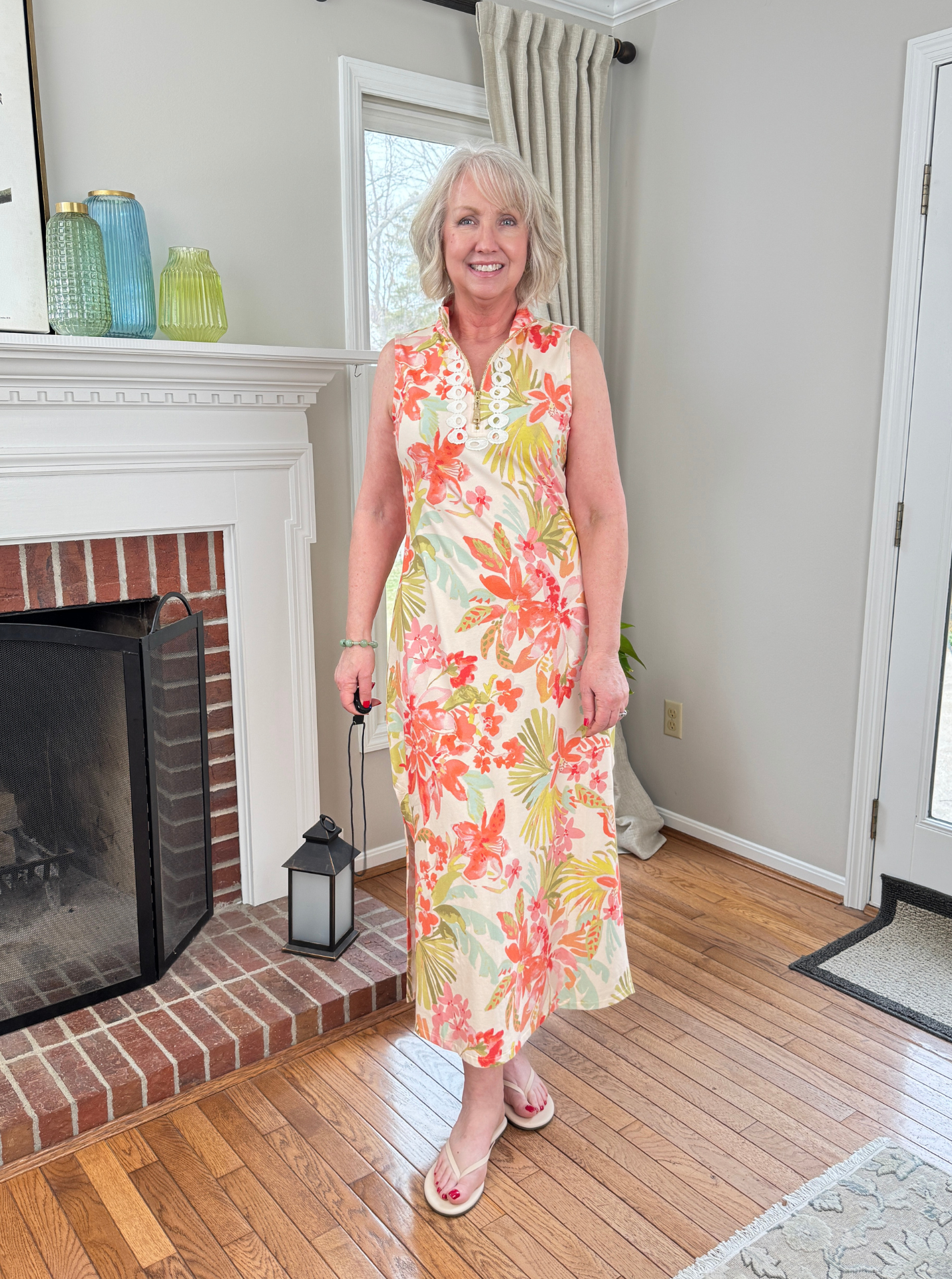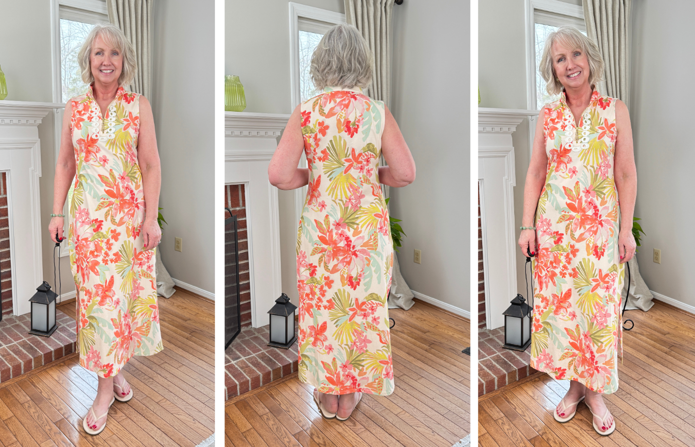 Above and below I’m wearing a new dress from Spartina449. This is the Serena midi dress in Castillo tropical. It fits beautifully true to size; I’m wearing a medium. It’s made from a super soft 95% Peruvian Cotton, 5% Spandex fabric and features a front zipper and pretty detailing at the neck.