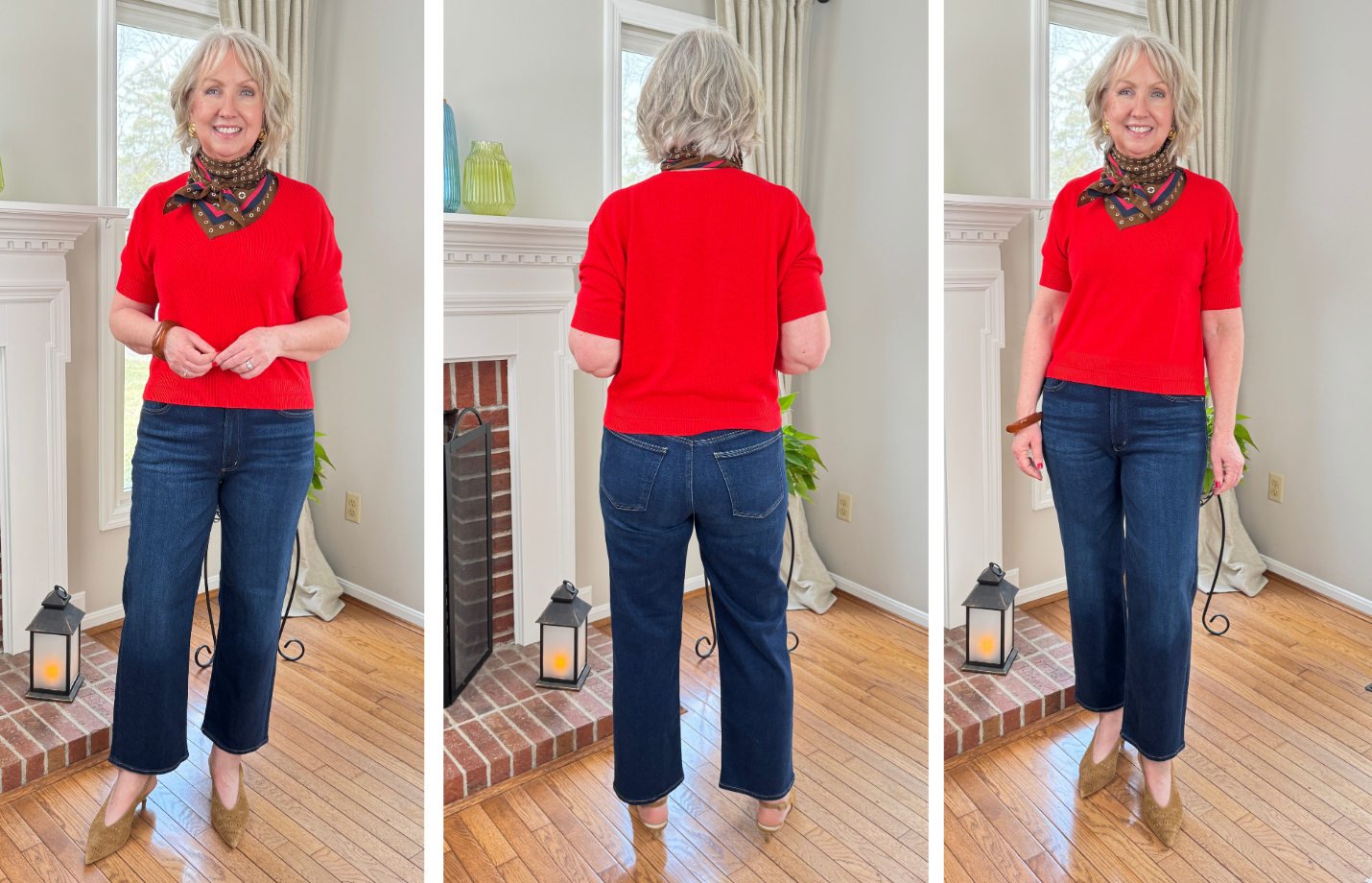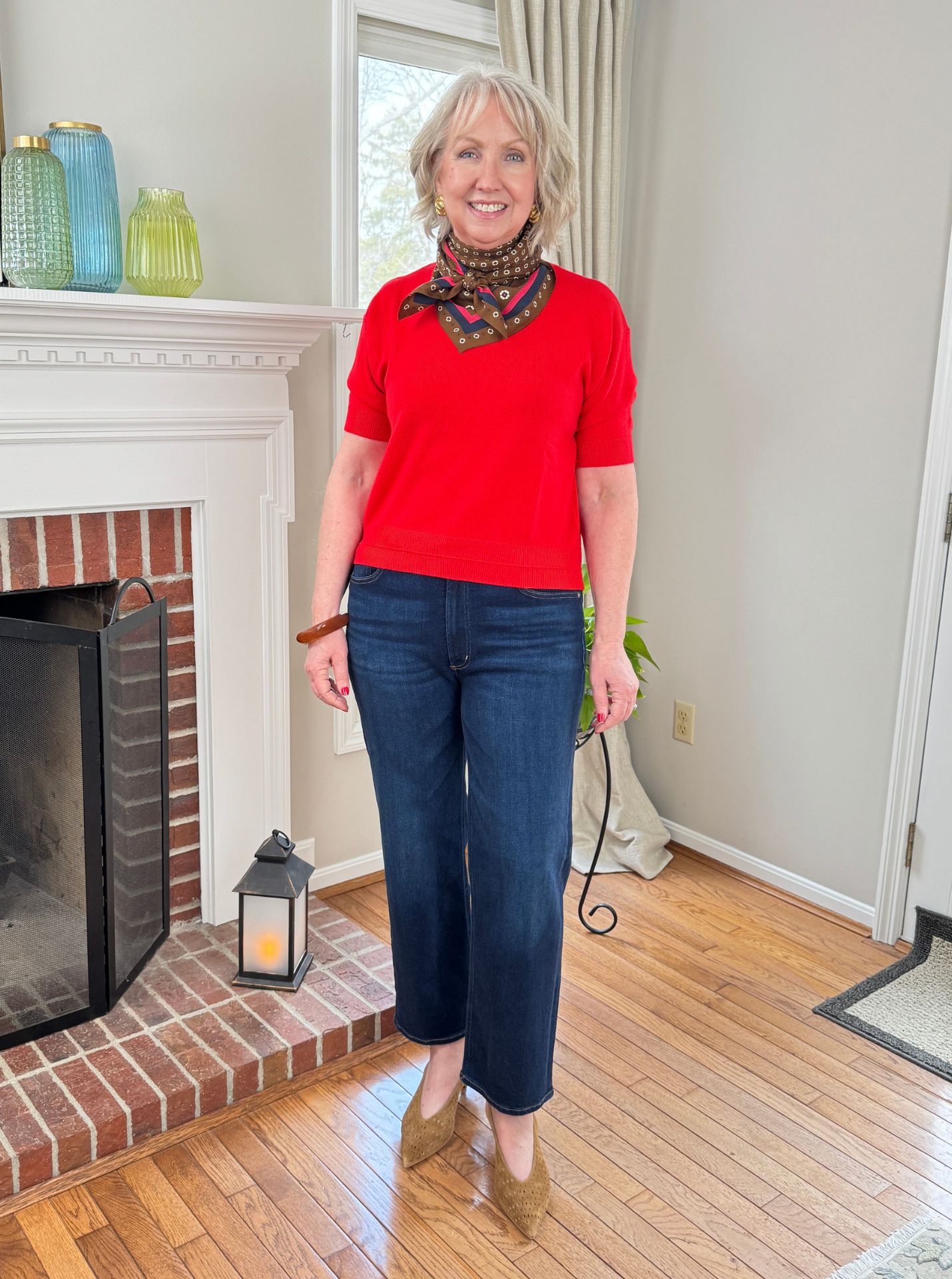 Above I’m also wearing a luxe new silk scarf from Eileen Fisher. I’ll definitely be taking this one with me to London to add versatility to my capsule travel wardrobe. And below I’m wearing that pretty brown, navy and red silk scarf from Madewell again with a relaxed cashmere tee in ruby red and dark wash straight leg jeans from Citizens of Humanity.