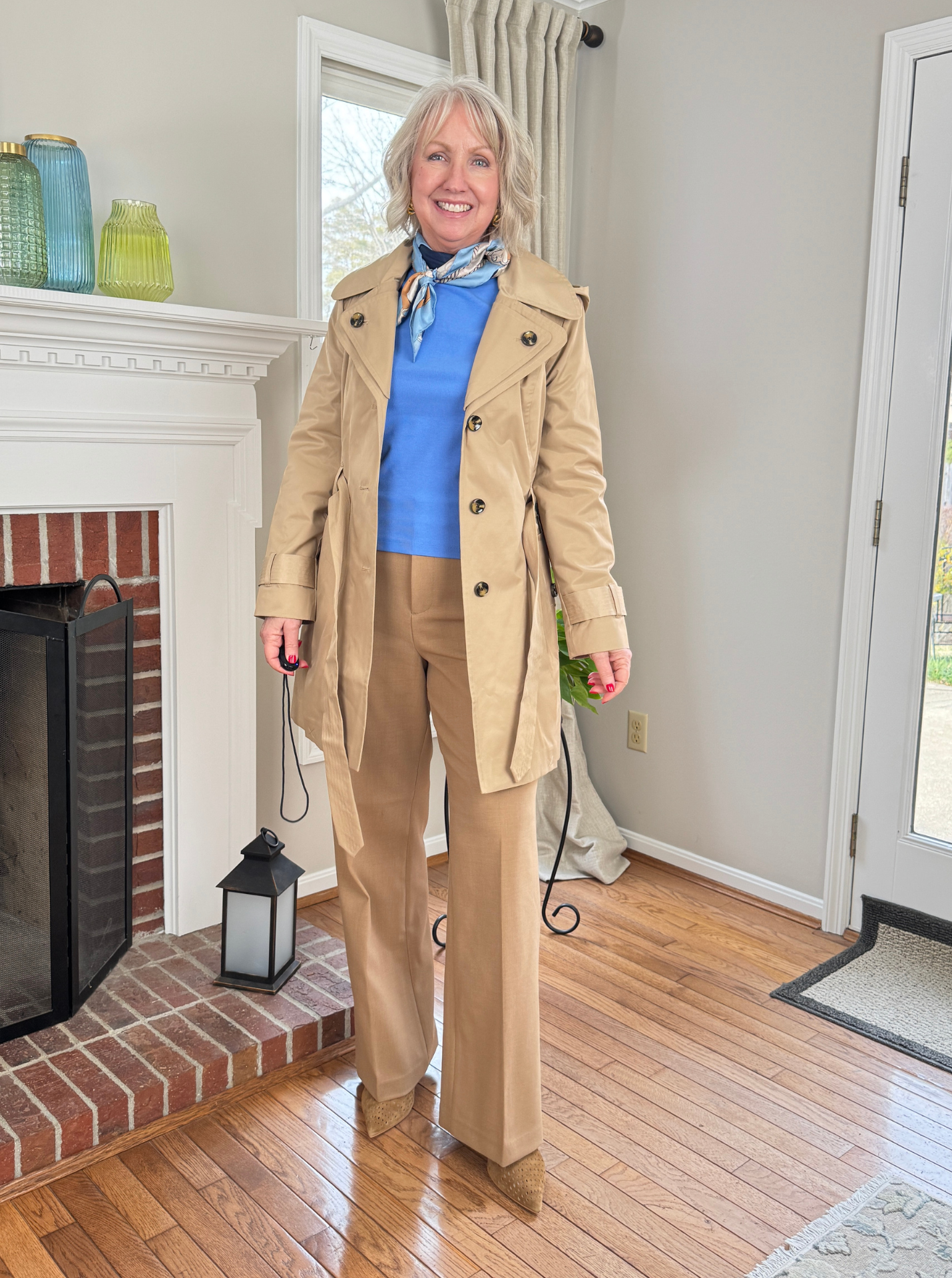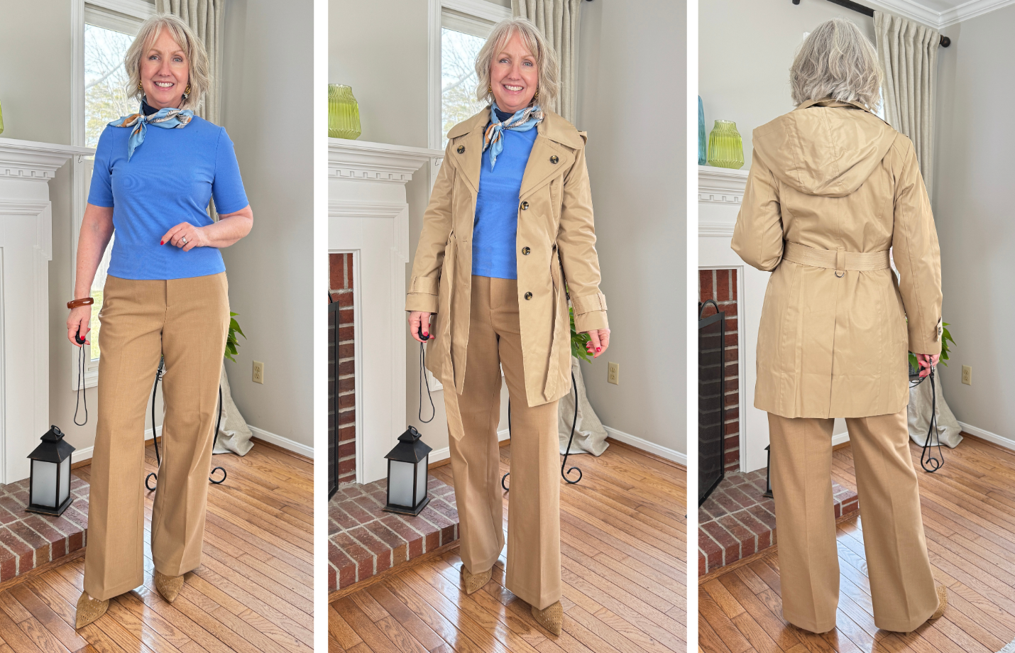 Above and below I’m wearing some new pieces from Spanx under a trench coat from London Fog. The trench coat outer shell is 57% cotton, 43% polyester for a water-repellant finish. It’s single-breasted with a tie belt and a removable hood. I like the double-collar detail and the fit is really nice true to size. The jacket is also available in what appears to be a soft turquoise, but they call it green. Both colors are currently 40% off and available in sizes XS to XXL.