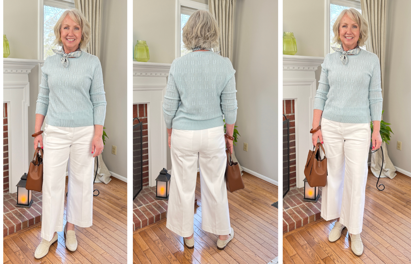 Above and below I’m wearing the Toulouse knit cardigan with paper white high rise wide leg jeans from Nic+Zoe. Out of caution, I did size up to a 31 in these, but they are a little roomy. That said, since they are white I’m keeping this size. The denim fabric is 52% cotton, 36% rayon, 10% recycled polyester, 2% spandex, so they have nice stretch and are dense, not see-through. They have a 31″ inseam and a 12 1/4″ rise. They also come in a pretty blue, which is available in petite sizes, too. I’ve found my dressier white jeans for the spring and summer.
