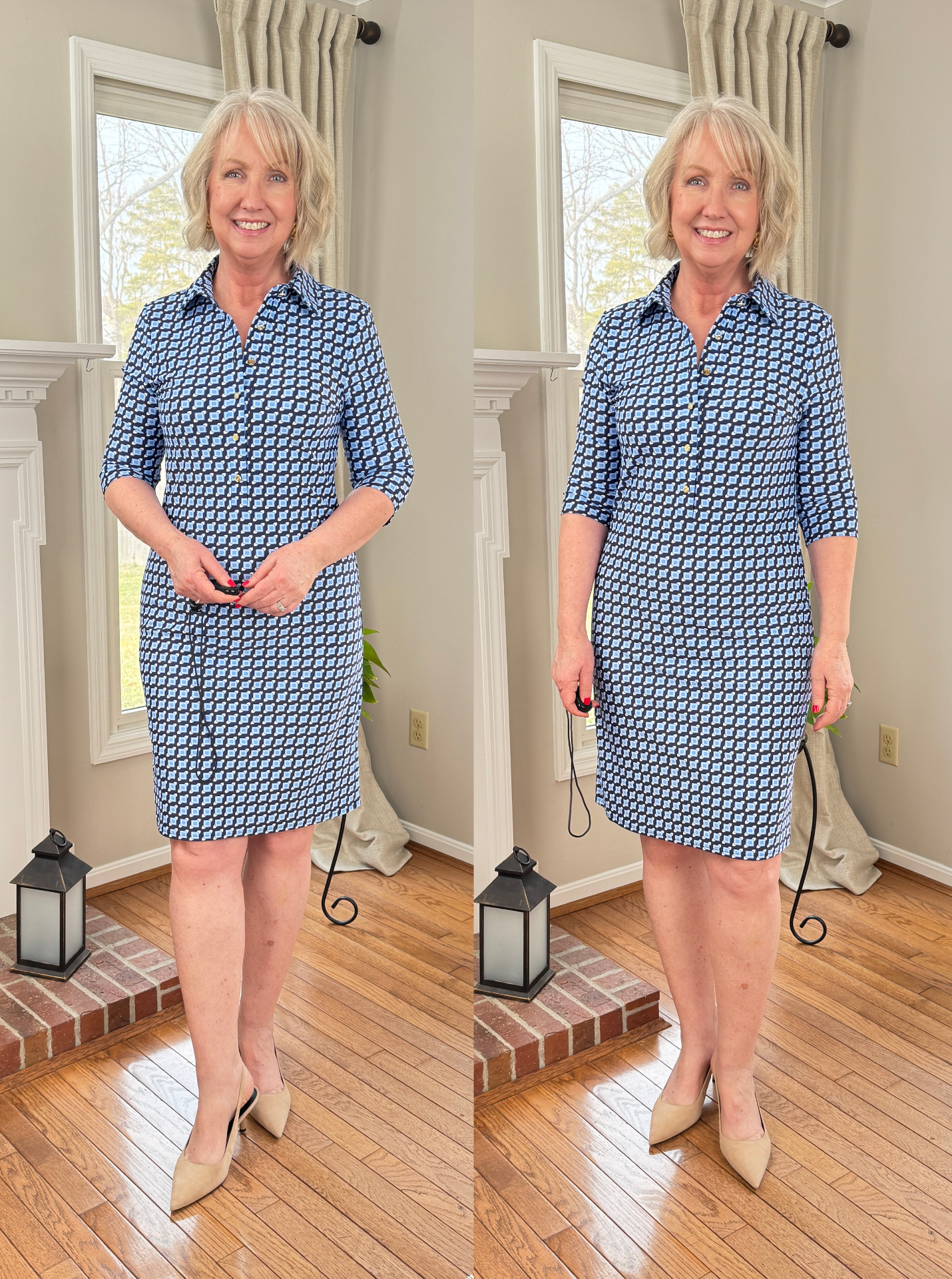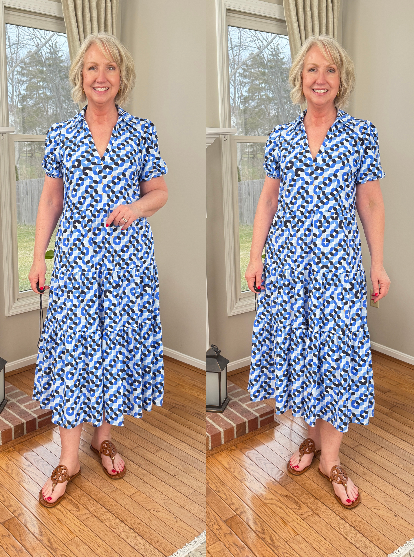 The Susanna dress above is in the square dot pattern, and again I’m wearing the longer length. It comes in several other pretty prints and colors, too. I think it fits true to size for a slim fit.