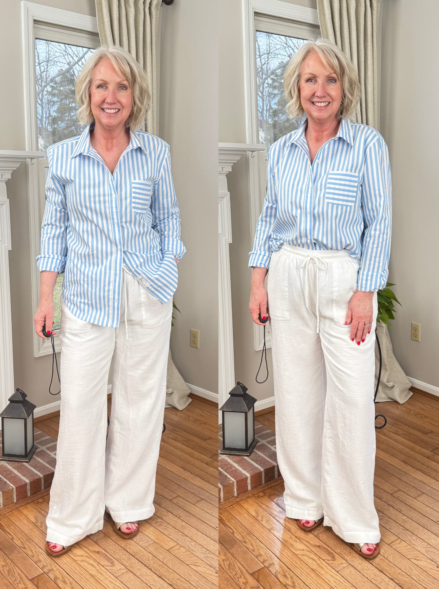 Above I’m wearing a couple of pieces from a new to me brand, Southern Tide. These beach ready Laken wide leg gauze pants are 100% cotton, machine washable and lined (also in silky, soft cotton). They fit nicely true to size and are quite long (remember, I’m 5’8″). The Emery button front shirt is 100% cotton poplin and also available in a pretty pink and white stripe. It fits very comfortably true to size as well. These would make great beach vacation essentials that you could mix and match, and you could wear both pieces as swimsuit covers, too.
