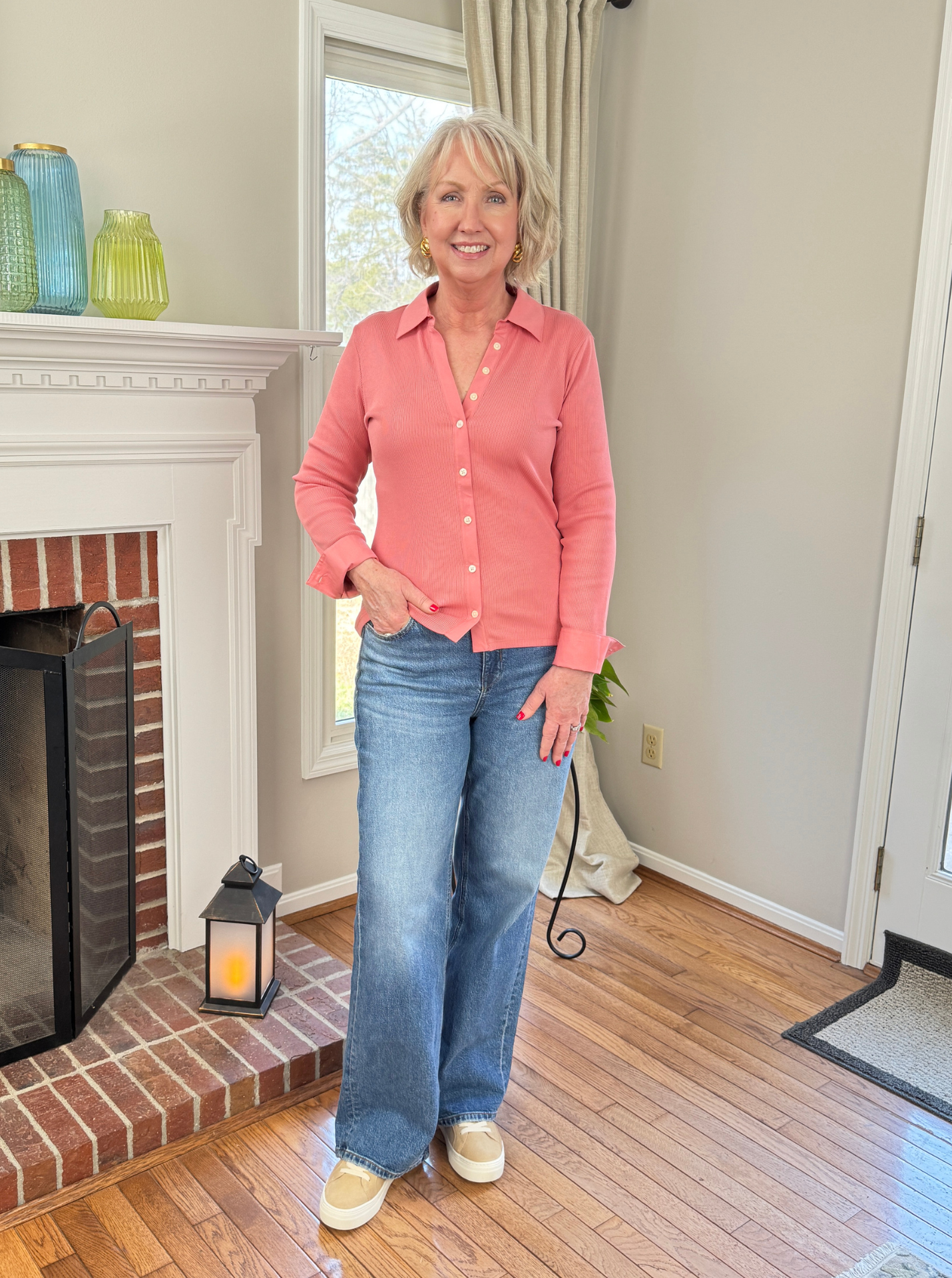 Below and above I’m back to the Ayr jeans and a new J.McLauglin shirt. This is the Theodora and it comes in a range of pretty colors. The mauve pink I’m wearing is especially pretty for spring. I do recommend sizing up in this top for a less body hugging fit. I think it’s a nice length to wear untucked with full length jeans and pants.