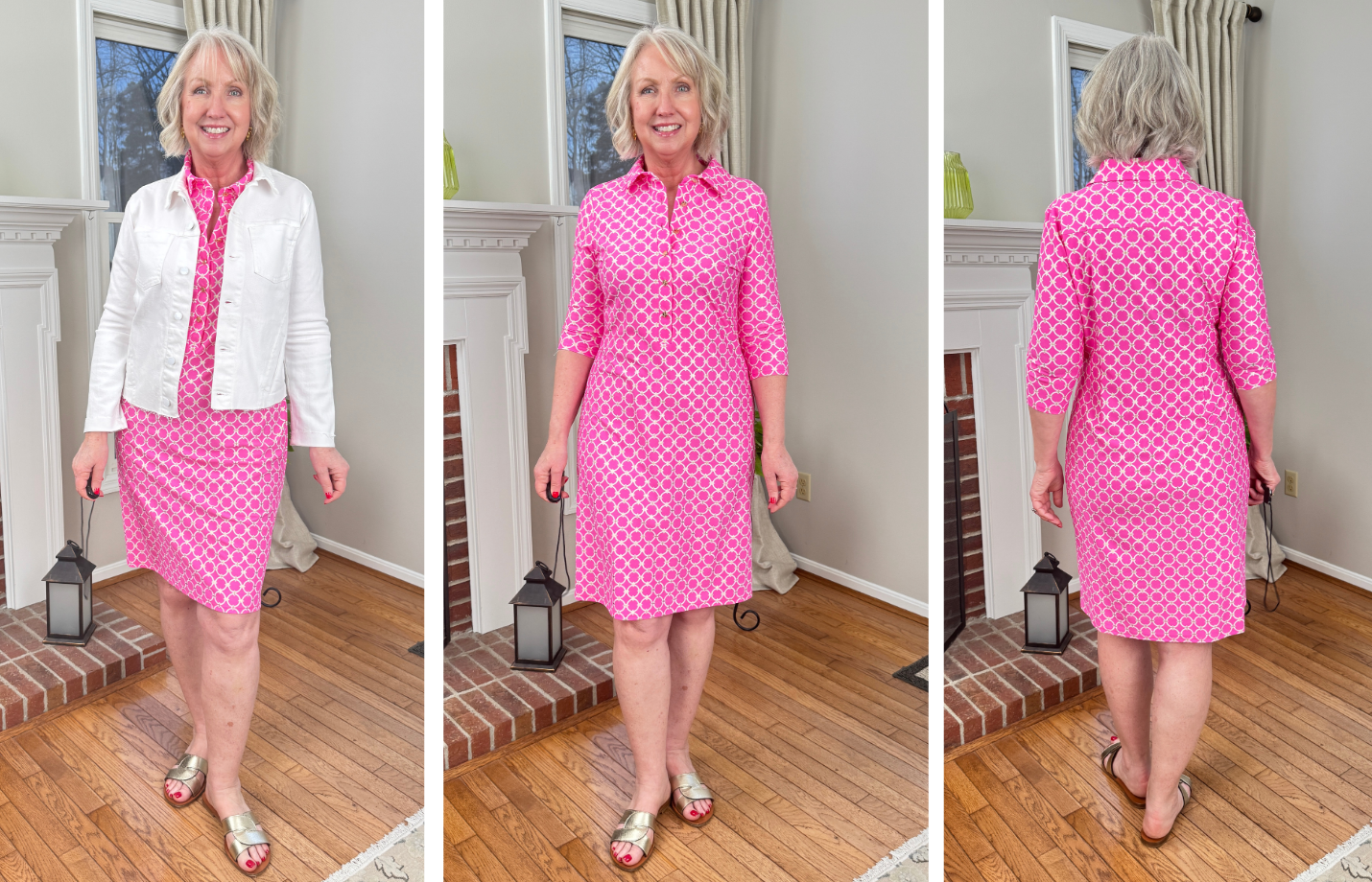 The Susanna shirtdress is one of my favorite silhouettes. I always get it in the longer length, but it does come in a shorter length, too. I’m wearing it with my M.Gemi sandals, which I’ve had for three years now, but they have these popular shoes again this year. They come in other colors, too, and fit true to size. I’m also wearing a new blanc Janelle jean jacket from L’Agence. I have this stretchy denim jacket in two other colors and absolutely love it. It’s lightweight and a slim fit. I size up to a large.
