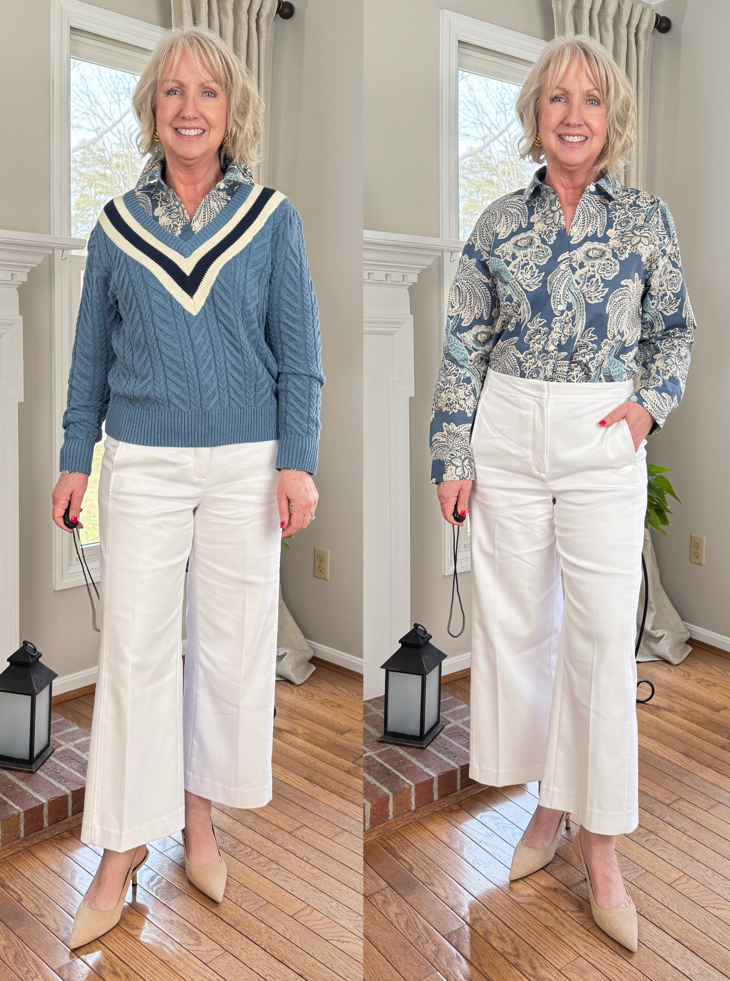 Above I’m back in the (un-pressed) Grace pants from Ann Taylor and my Nordstrom slingback pumps, but this time with a print button-down shirt from Spartina449. This Adelaide relaxed fit shirt is part of their new St. Augustine collection. It fits beautifully true to size. On the left I’m wearing the Lorna varsity sweater in bluestone with the shirt. This 100% cotton sweater is super soft, fits true to size and also looks equally nice by itself.