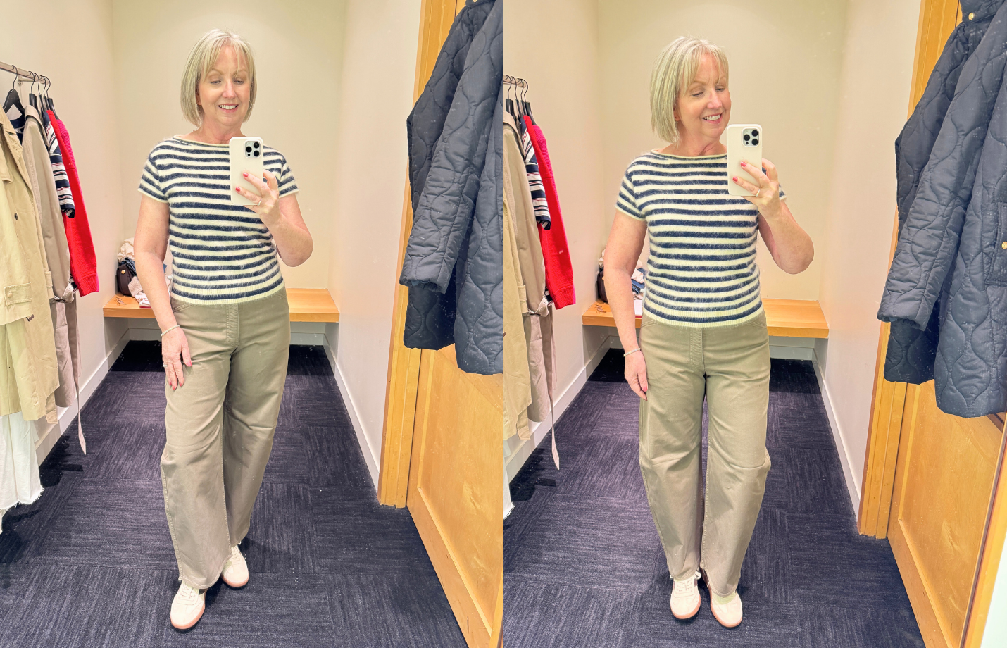 And below I’m wearing a brushed cashmere boatneck t-shirt in an on trend navy candlelight stripe over a pair of Zoe barrel pants in 97% cotton/3% elastane. I’m wearing my true size 30 again here, and once again the website recommends sizing up. As I recall, these distant surplus green pants did indeed feel a little snug. They fastened, but they’re weren’t especially comfortable in this size. So I agree: size up. They’ve available in petite and tall sizes, too. I didn’t purchase them, but they’re a nice casual pant.