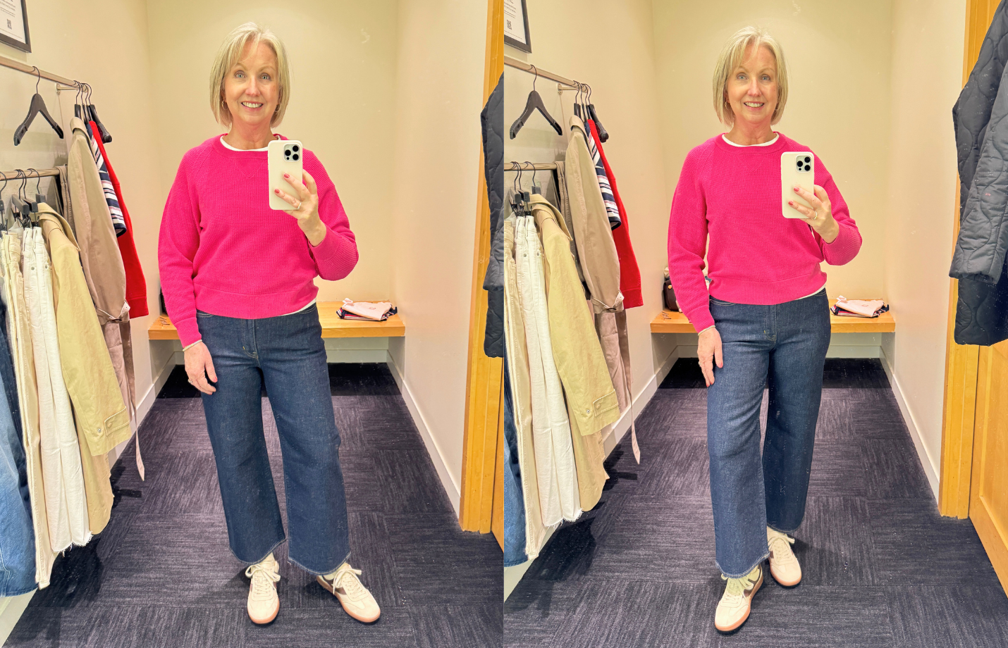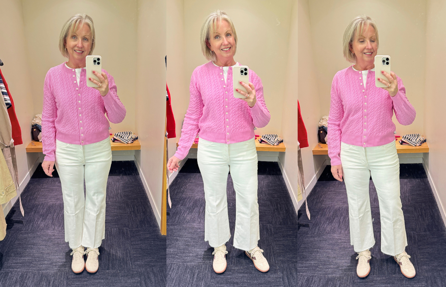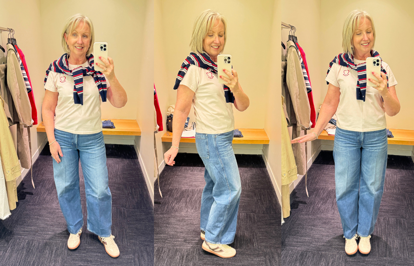 Please keep in mind that these are photos taken on my phone in poor lighting. Also, I’ve been pulling clothes off and on in a tight space. So my hair is a mess, my makeup is melting and I look pretty kerplunked. Ha! So please just focus on the clothes and give a little grace to the lady with the phone in her hand trying to look decent in fitting room lighting. For reference, I’m 5’8″ and weigh about 160 pounds. I have even proportions and an hourglass shape. I usually wear a size misses 10 or 30 in jeans or mediums. I’m showing all garments in those sizes unless otherwise noted.