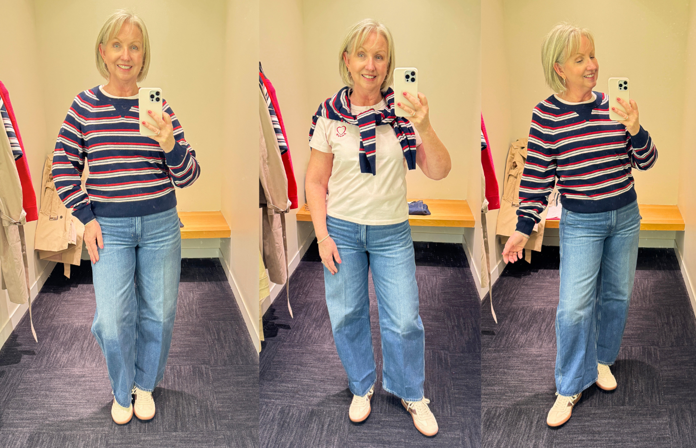 Next I’m sharing a sweet boyfriend jersey classic-fit T-shirt with heart embroidery, a striped cashmere crewneck sweatshirt and a pair of modern Zoe barrel jeans. The classic-fit T-shirt fits true to size and I appreciate the length – great for tucking or leaving untucked. By the way, it’s in the lightest shade of pink. The cashmere crewneck sweatshirt is such a fun piece, truly has that sweatshirt feel and silhouette, but in luxurious cashmere. And you may not be able to tell, but the stripes are navy, red, soft pink and ivory. I ordered the “sweatshirt” and t-shirt.