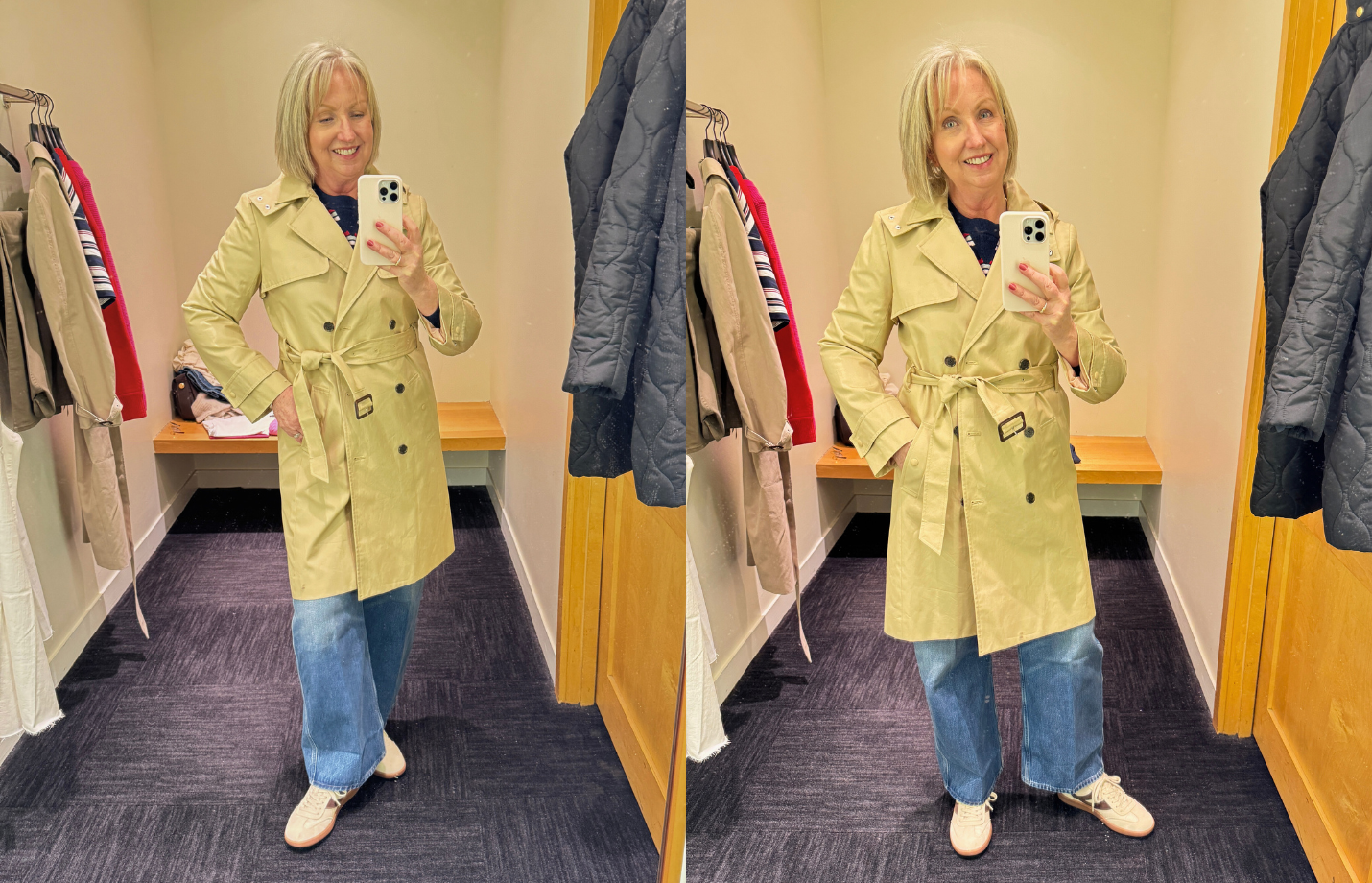 Above I’m wearing another New Icon trench coat. This one may be from last year, but it’s still available in most sizes. It’s a very different trench than the other shown above. This one is much more traditional with all the classic elements. (See this recent blog post for more details.) It’s stiffer, but still has a nice feel. And it does feature a removable hood and is 100% cotton. This trench coat is marked down 28% currently and is also available in black. It does come in petite sizes, too. I didn’t purchase it because I have a similar one.