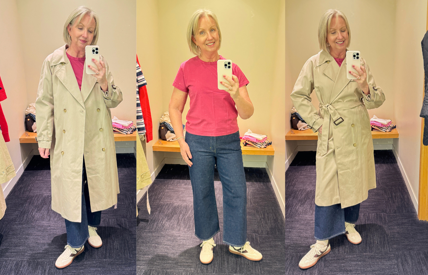The tee fits true to size for a casual fit, and the color is a pretty muted red in a cool tone. I’m wearing J.Crew’s New Icon trench coat in washed hazelwood over the outfit. You’ll see two trenches in this post, and this one is the drapier of the two. It’s a 59% cotton/41% polyamide shell with a polyester lining. I love the drape and length of this coat, specifically if you’re looking for one to wear with dresses. I found it to fit true to size, especially if you want to be able to wear it over layered garments. I did not purchase this coat because I don’t need it.