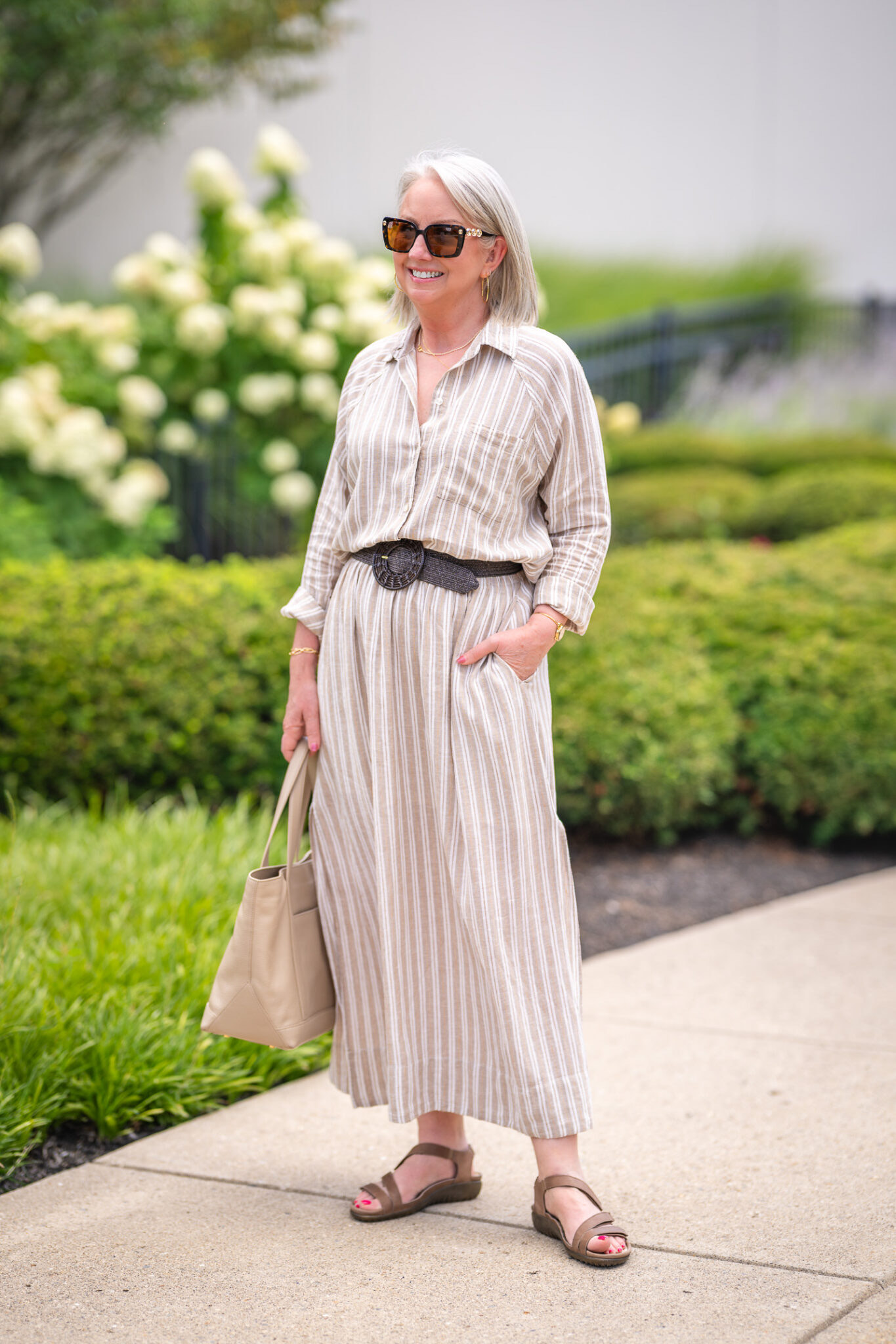 Now if I weren’t a fashion blogger and didn’t earn my income by showing available clothes, I’d probably have kept this button down top and skirt to wear next summer. But, due to my job, I pretty much get a new wardrobe each season. That’s not what I suggest or even my personal preference, by the way. It’s just the way it is. So I moved this button down top and skirt on out of my wardrobe. Cost per wear was not a bargain. That’s something to consider when you buy “good deals” at the end of the season.