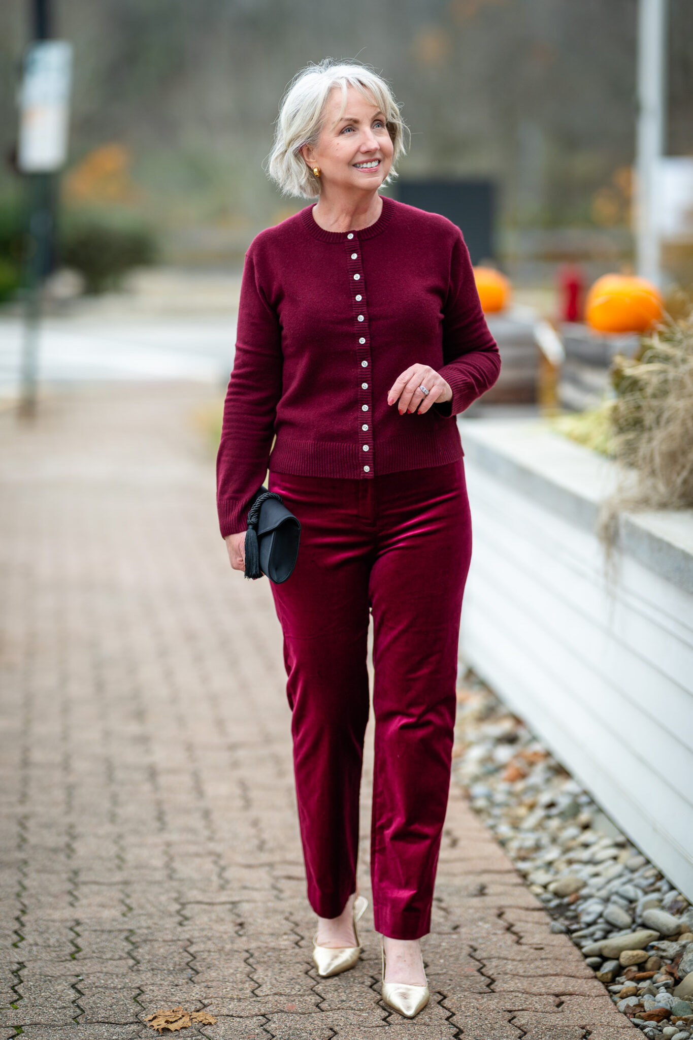 The wine colored Velvet pants and cardigan is my favorite outfit you modeled this year! I love that on you. I have a curvy body so J.Crew pants do not work on me, but I think that it is gorgeous on you.!
