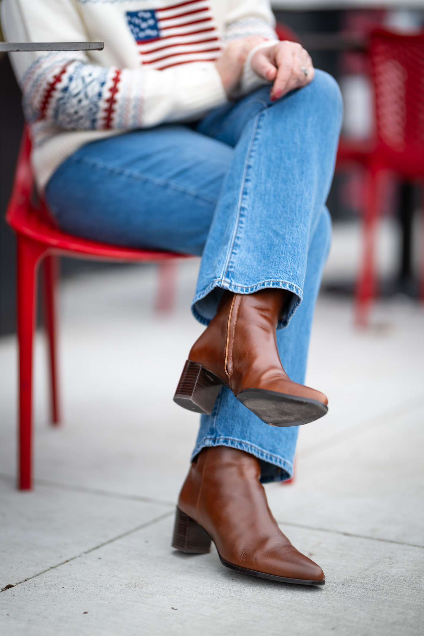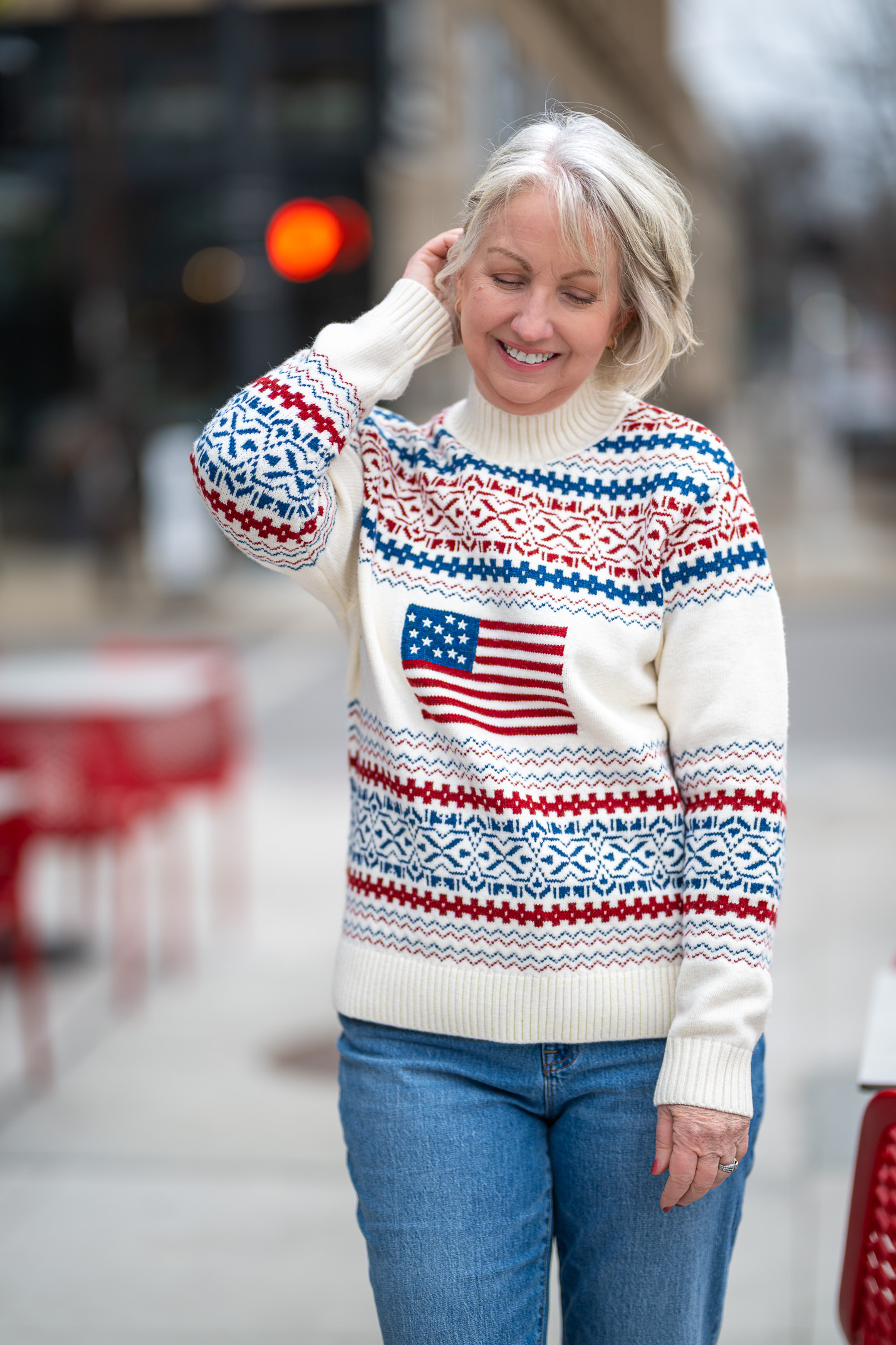 Kay, I like the patriotic sweater and how you wore it with jeans and brown leather booties. It looks very nice on you.