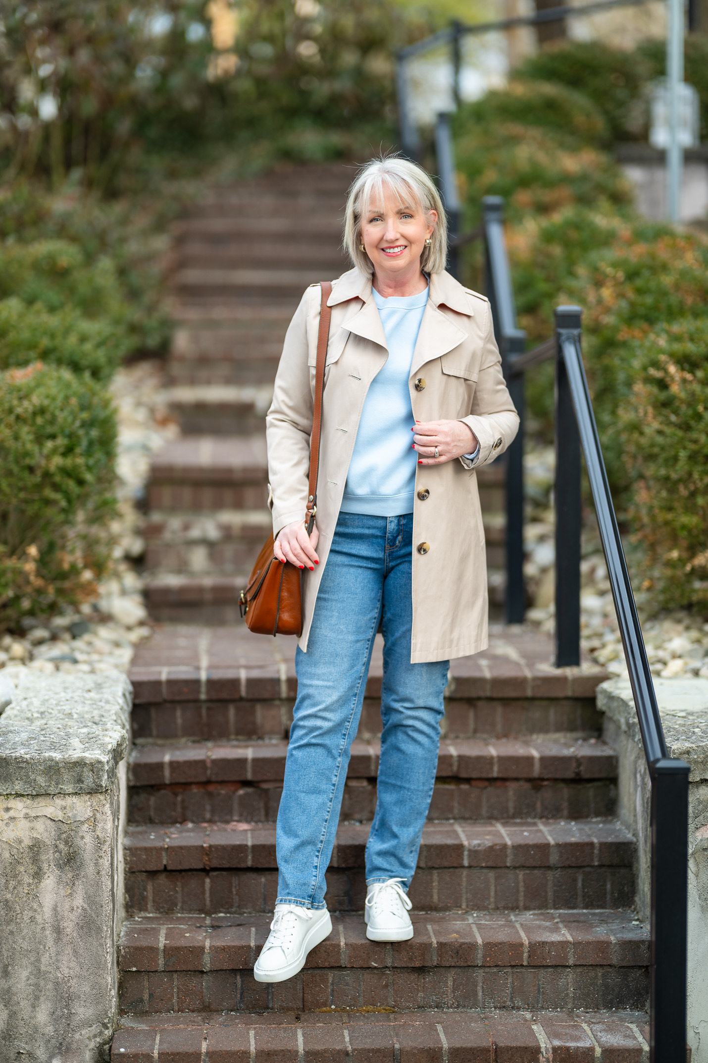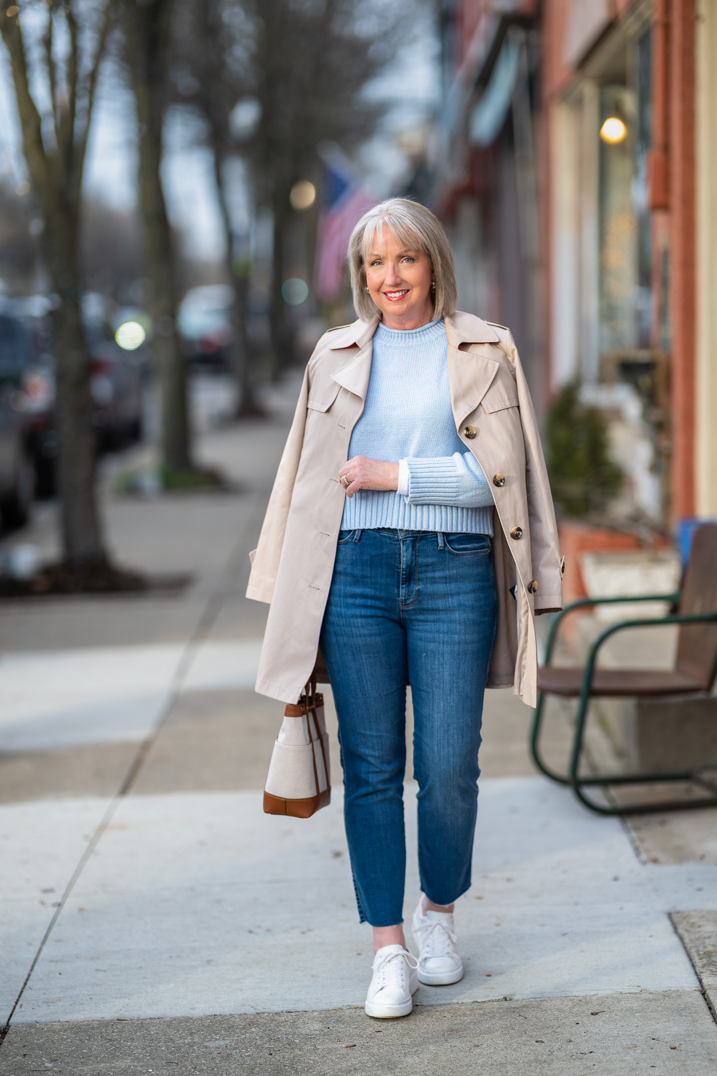 Most importantly, I love that a trench coat adds structure and class to your outfit. And yes, you can wear it with almost everything in your closet. Wear it over blue jeans and a bright colored cashmere sweater, like I did above. Or top a sweater in the same color like I did below, still keeping the outfit relaxed and casual with jeans and sneakers.