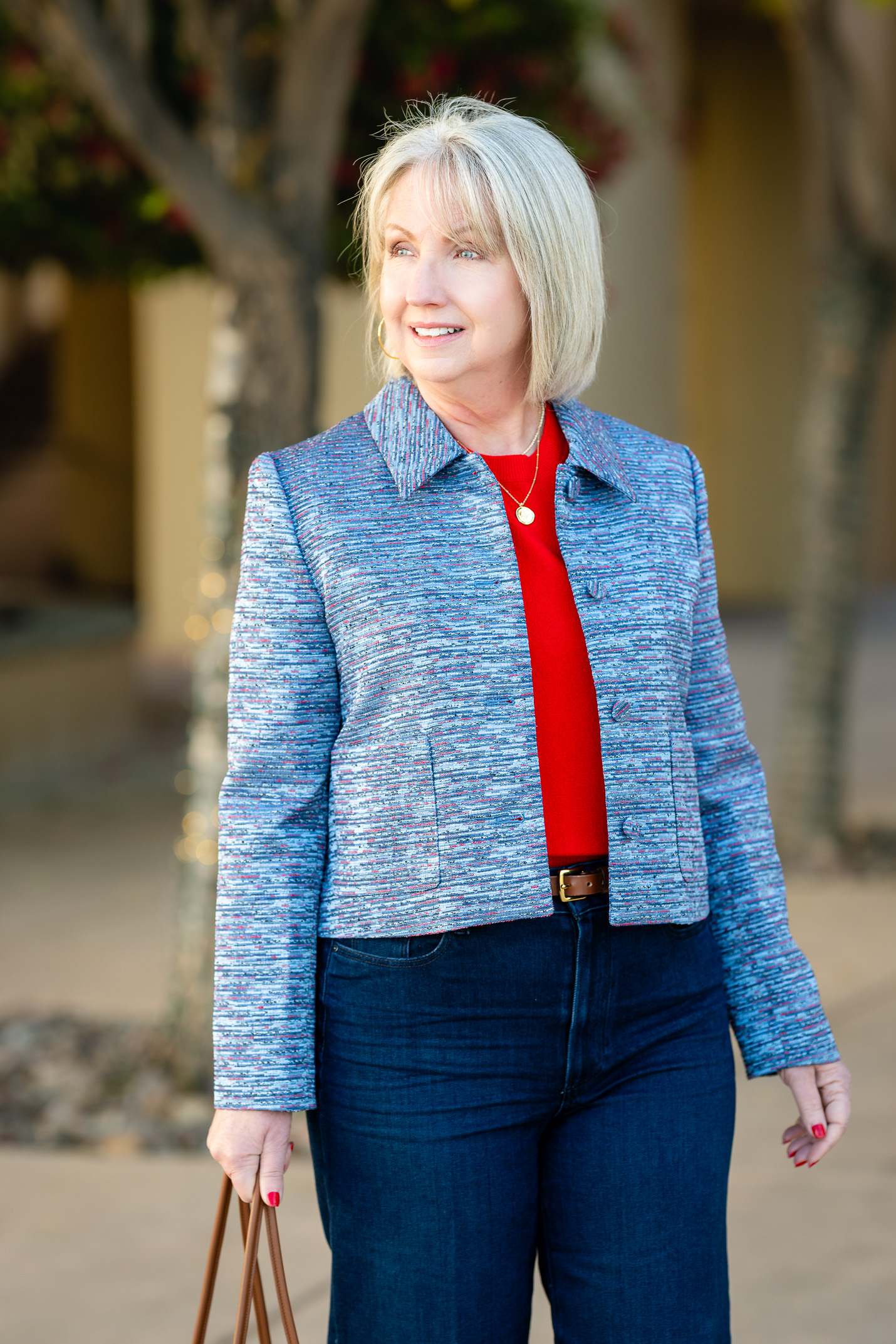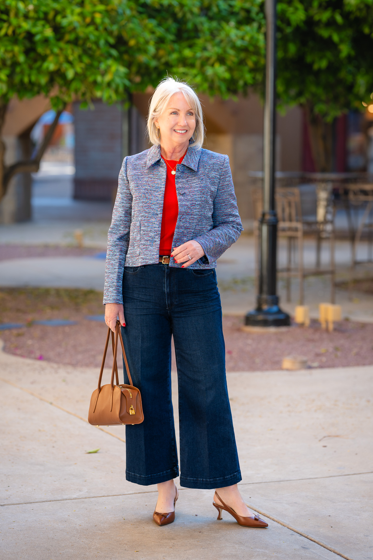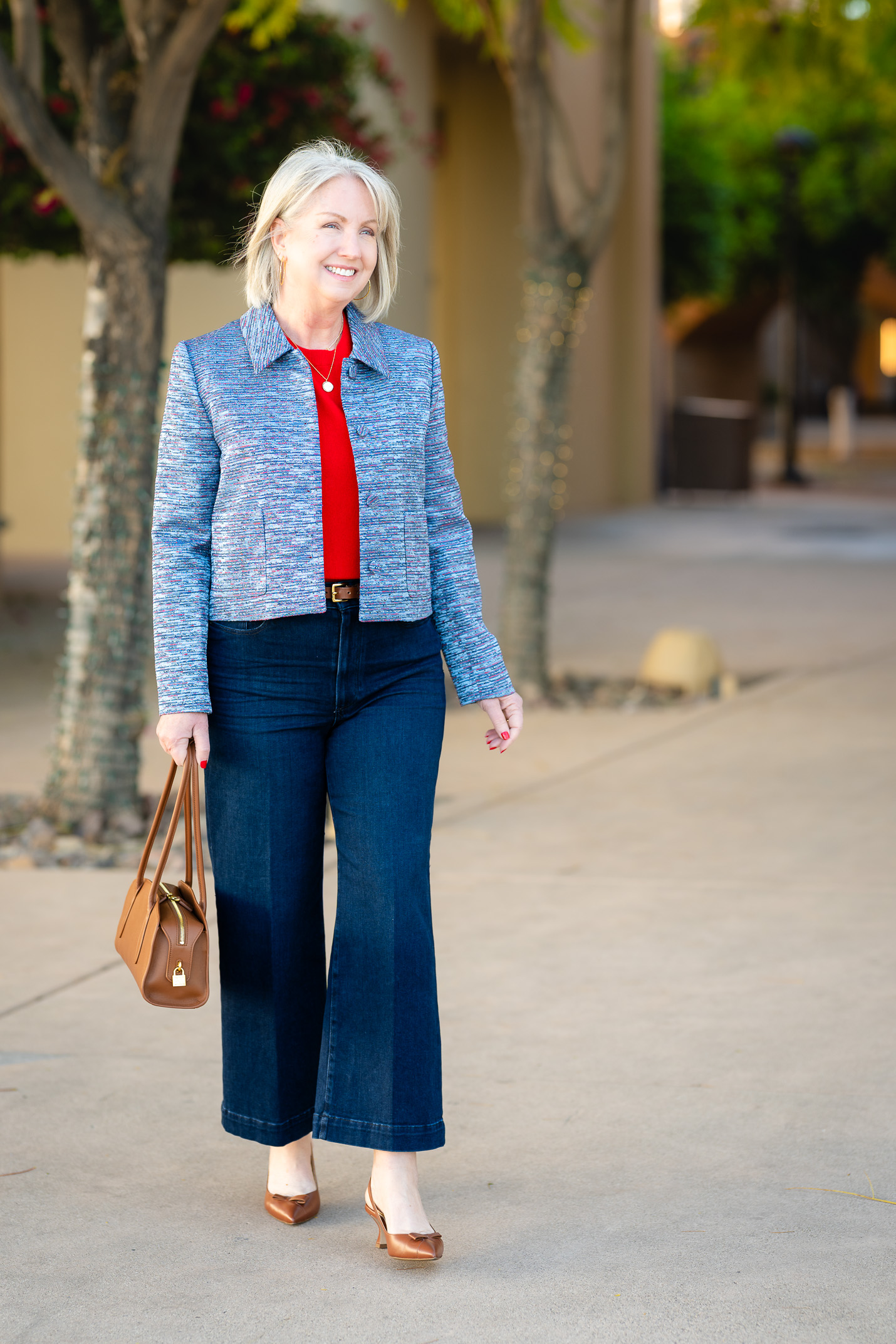 So can I wear this textured tweed lady jacket in three outfits, for three different occasions and with three pairs of shoes? When the jacket arrived I headed straight to my closet to do the math. The lady jacket, which runs true to size for a modern, boxy, cropped fit, features beautiful shades of blue and a striking red thread that runs through it. First I wore it over a navy V-neck t-shirt with a pair of full length white jeans. I completed the look with strappy cognac sandals for a look I would definitely wear to church.